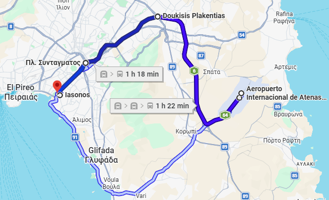 The following image shows the route from Athens International Airport to Athens Marriott Hotel.