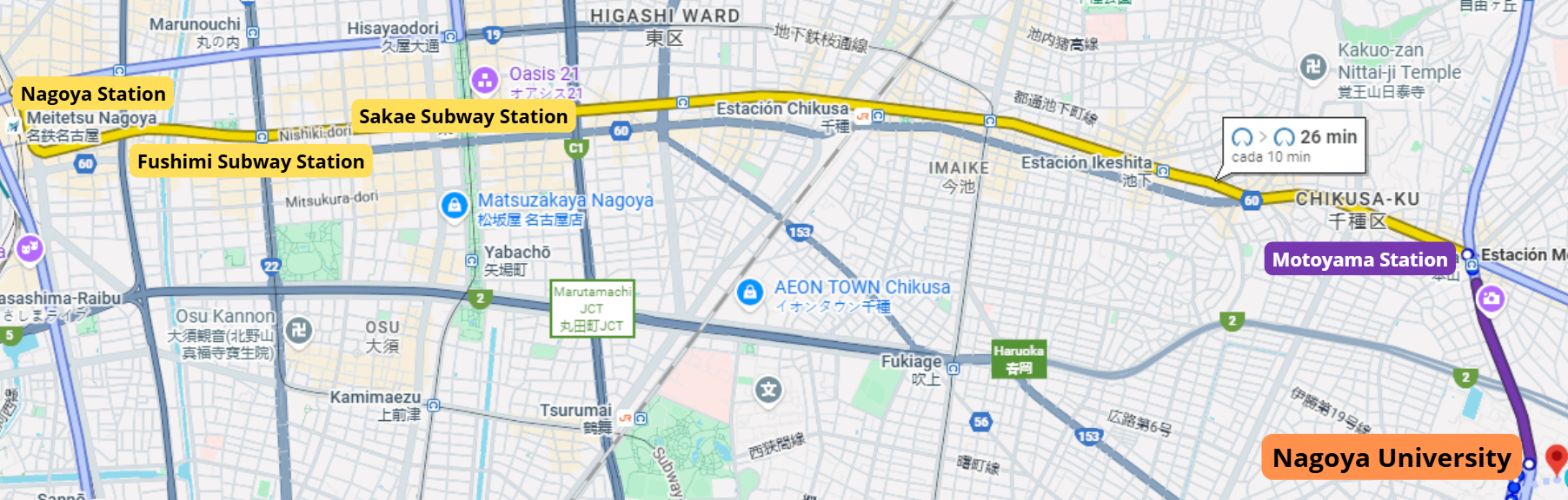For easy access to the Nagoya university, we recommend staying near the Higashiyama Subway Line (yellow line). From this line, you can travel directly to Motoyama Station, where you can transfer to the Meijo Line (purple line). From there, it is just one stop to Nagoya Daigaku Station, located right next to Nagoya University.