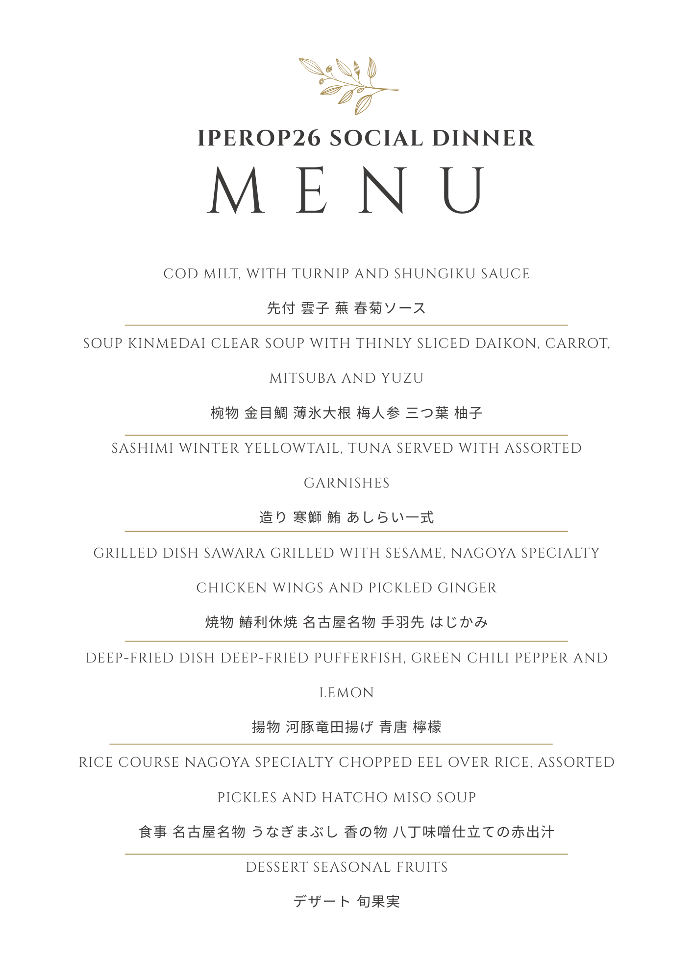 Social dinner will take place at the Hilton Hotel Nagoya on Wednesday January 14th at 20:00h.