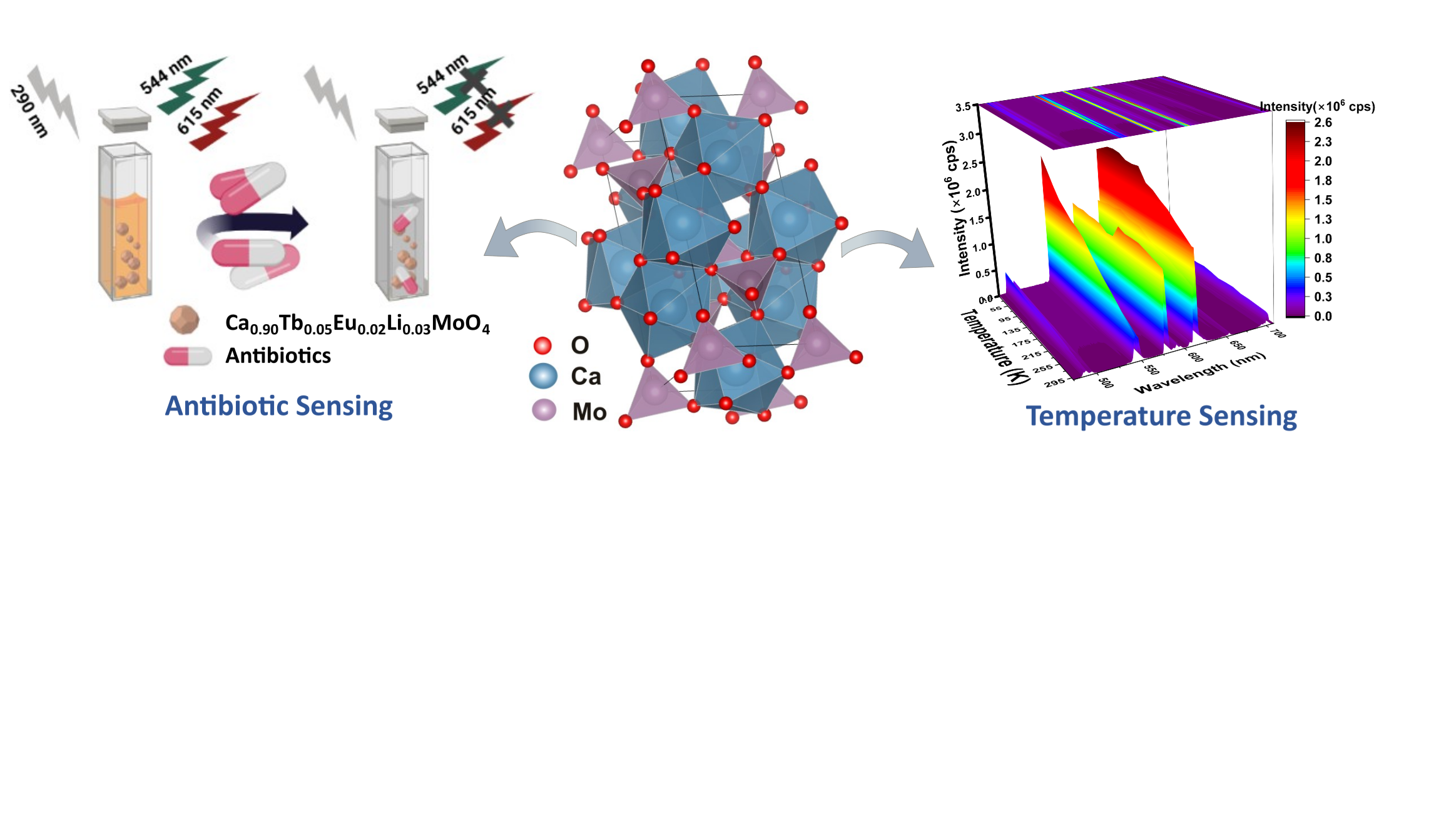 The optimized CaMoO₄:Tb³⁺-Eu³⁺-Li⁺ phosphor was assessed for multifunctional applications. Firstly, the Tb³⁺ to Eu³⁺ energy transfer facilitated tunable emission from the green to red spectral regions, demonstrating potential for solid-state lighting and display applications. Secondly, the material showed strong PL quenching in the presence of antibiotics, suggesting its feasibility as an optical antibiotic sensor. Thirdly, temperature-dependent photoluminescence (TDPL) studies were conducted over a wide temperature range (15K–573K). At low temperatures (15K–300K), the luminescence intensity exhibited systematic quenching due to thermal effects, with the highest absolute sensitivity (Sa) observed for I486/I591 (6.87 × 10⁻³ K⁻¹ at 300 K). The highest relative sensitivity (Sr) was recorded for I544/I615 and I646/I701 (1.24% K⁻¹ at 300 K), demonstrating a strong temperature-dependent response. Furthermore, at elevated temperatures (303K–573K), the phosphor retained 88% of its luminescence at 423K, indicating excellent thermal stability and suitability for high-temperature optical thermometry. These findings establish CaMoO₄:Tb³⁺-Eu³⁺-Li⁺ as a promising multifunctional phosphor for optoelectronic and sensing applications, including ratiometric temperature sensing.
