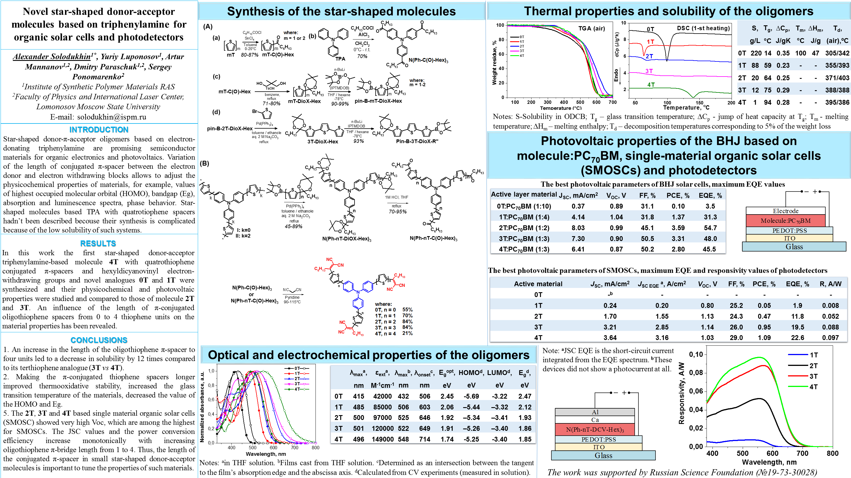 Star-shaped donor-π-acceptor oligomers based on electron-donating triphenylamine are promising semiconductor materials for organic electronics and photovoltaics [1-5]. Variation of the length of conjugated π-spacer between the electron donor and electron withdrawing blocks allows to adjust the physicochemical properties of materials, for example, values of highest occupied molecular orbital (HOMO), bandgap (Eg), absorption and luminescence spectra, phase behavior. Star-shaped molecules based TPA with quatrotiophene spacers hadn’t been described becouse their synthesis is complicated because of the low solubility of such systems. In this work the first star-shaped donor-acceptor triphenylamine-based molecule 4T with quatrothiophene conjugated π-spacers and hexyldicyanovinyl electron-withdrawing groups and novel analogues 0T and 1T with different length of π-conjugated oligothiophene spacers were synthesized and their physicochemical and photovoltaic properties were studied and compared to those of molecule 2T and 3T. An influence of the length of π-conjugated oligothiophene spacers from 0 to 4 thiophene units were used to study the structure – properties – device performance relationships for these novel molecules.