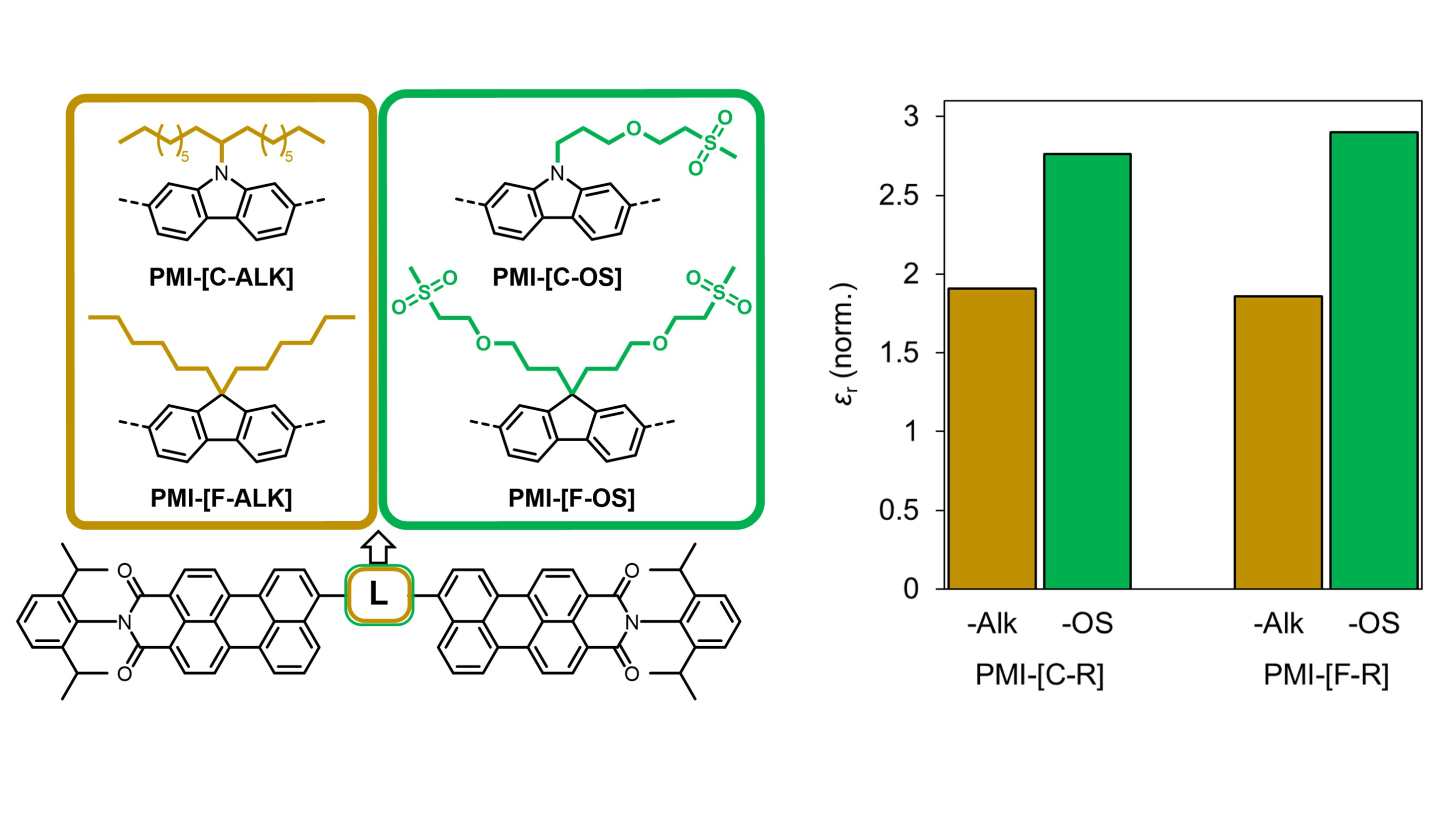 Furthermore, we extended this approach to the popular Y-series acceptors and synthesized Y6-derivatives with flexible glycol side chains. In one compound the functionalization was done on the outer thiophene position, the second acceptor bears glycol chains on the pyrrole unit. These compounds exhibit significantly higher permittivities (4.73 and 5.24) compared to Y6 (2.39), while maintaining the beneficial properties of this acceptor family. Besides a detailed morphology investigation of blends of the high-ε Y6-derivatives with PM6, we also present first results of their photovoltaic properties.