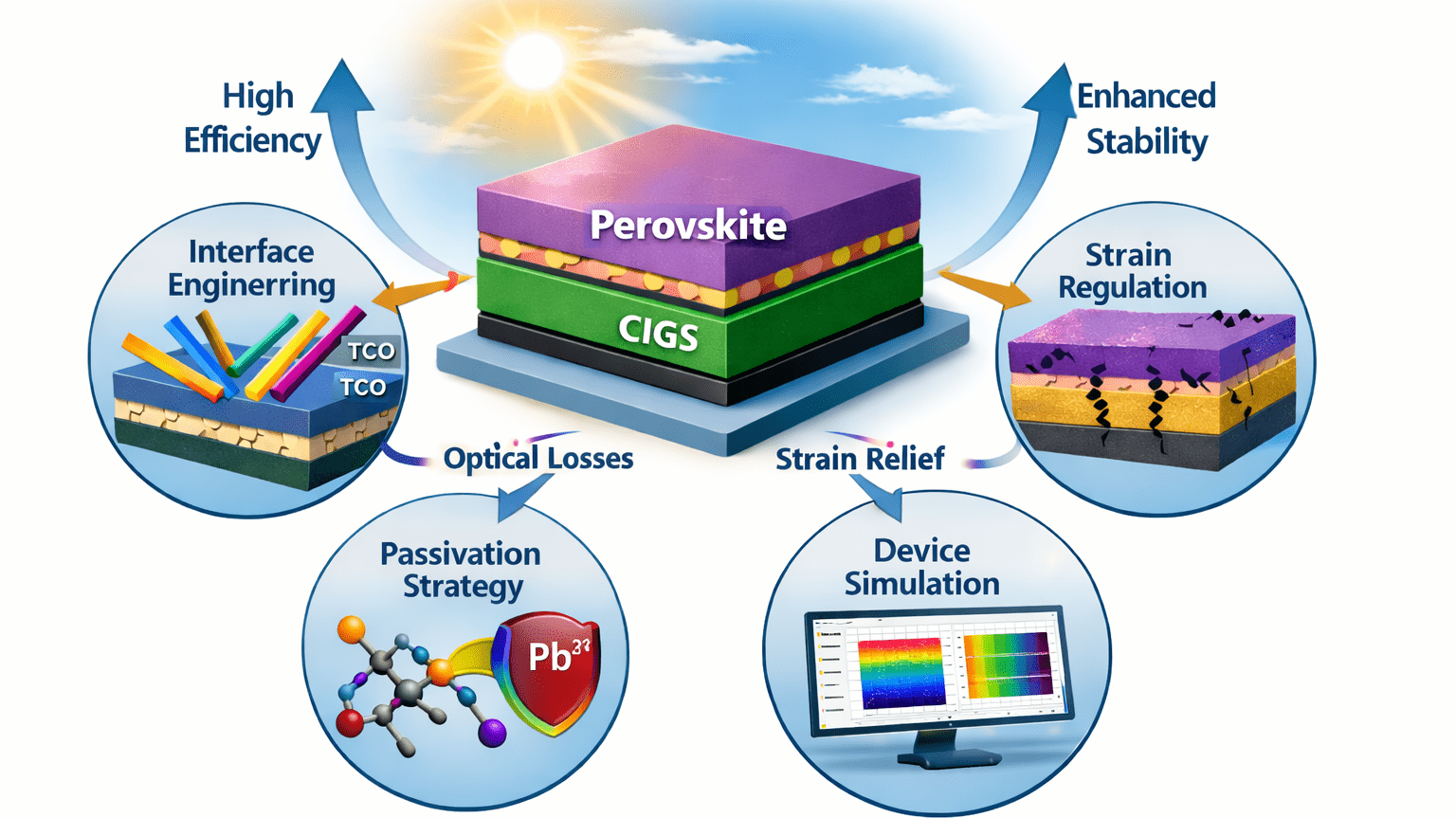 In this talk, I will present recent advances from our laboratory that address these challenges through interface engineering, strain regulation, and multiphysics-guided device design. For four-terminal tandems, we identify parasitic absorption in transparent electrodes and interfacial reflection as dominant optical loss pathways, and demonstrate systematic mitigation strategies that enable highly efficient perovskite/CIGS tandems with minimal optical penalties. For monolithic two-terminal tandems, we establish a molecular-level understanding of passivation failure in wide-bandgap perovskites and develop thermodynamically and kinetically stable passivation strategies that suppress cation desorption and under-coordinated Pb defects. Furthermore, we reveal how the surface roughness of the CIGS bottom cell governs strain formation and defect evolution in the perovskite top cell, enabling strain-relieved tandem devices with certified stabilized efficiencies above 28%. Together, these findings establish general, physics-based design principles for efficient, stable, and scalable perovskite/CIGS tandem photovoltaics.