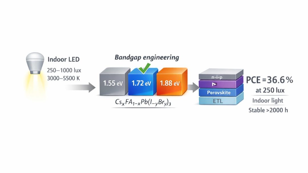 Perovskite indoor photovoltaics (IPVs) are emerging as a transformative technology for low-light intensity energy harvesting, owing to their high-power conversion efficiencies (PCEs), low-cost fabrication, solution-processability, and compositionally tunable band gaps. In this work, methylammonium-free CsxFA1-xPb(I1−yBry)3 perovskite absorbers were compositionally engineered to achieve band gaps of 1.55, 1.72, and 1.88 eV, enabling spectral alignment with indoor lighting. Devices based on a scalable mesoscopic n-i-p architecture were systematically evaluated under white LED illumination across correlated color temperatures (3000–5500 K) and light intensities from 250 to 1000 lux. The 1.72 eV composition exhibited the most robust performance across different light intensities and colors, achieving PCEs of 35.04% at 1000 lux and 36.6% at 250 lux, with stable device operation over 2000 hours. While the 1.88 eV band-gap variant reached a peak PCE of 37.4% under 250 lux (5500 K), however performance trade-offs were observed in current density and consistency. Our combined experimental and theoretical optical-electrical simulations suggest that decreasing trap-assisted recombination in wide-bandgap compositions may further improve IPV performance across varying illumination conditions. In contrast, devices with a 1.55 eV band gap underperformed due to suboptimal spectral overlap. These findings establish bandgap optimization and device architecture as key design principles for high-efficiency, stable perovskite IPVs, advancing their integration into self-powered electronic systems and innovative indoor environments.