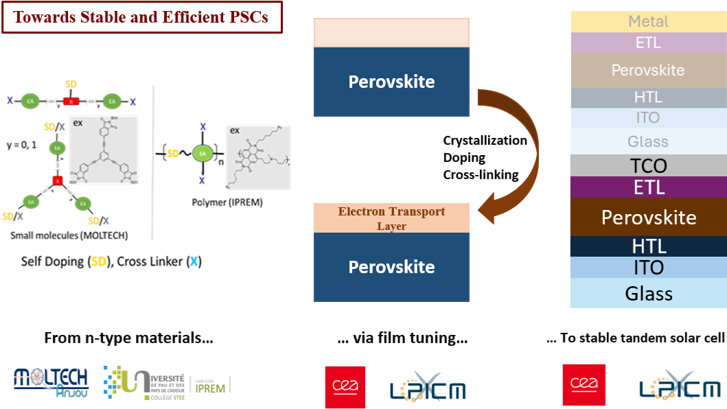 transport layers (ETLs) and their use in inverted perovskite solar cells (PSCs). The present study concentrated on two distinct methodologies, utilizing small molecules in one case and polymers in the other. The utilization of these materials has the potential to create a more compact layer, thereby protecting the perovskite layer from oxygen and water. This is a significant challenge in the field of PSCs and requires further study.5 Crosslinking has been demonstrated to enhance mechanical strength, a critical factor in ensuring durability. Furthermore, cross-linkable ETLs have the potential to act as an insulating layer against harmful environments and for lead sequestration. Moreover, these novel materials were incorporated into devices for the purpose of studying the stability of perovskite solar cells, whilst ensuring the continued efficiency of the devices.