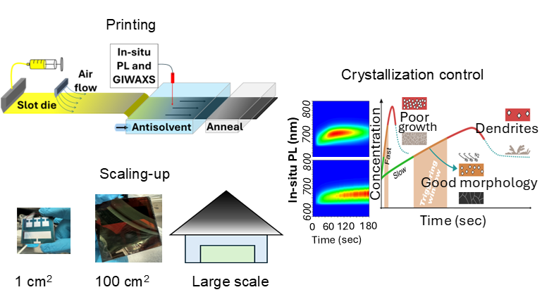 Here, we introduce a dynamic anti-solvent bathing method for scalable perovskite printing. Results across multiple compositions, including CsFAPbIXBr1-X, CsFAPbI3, MAPI3, and CsPbI3, show that this approach enables high-quality film formation, in most cases under ambient conditions and using green solvents. This method can be preceded by gas flow assisted drying. The anti-solvent bath can be used to facilitate targeted solvent or ions extraction, promoting effective crystallization. In situ GIWAXS and photoluminescence spectroscopy, in addition to NMR and FTIR reveal the crystallization mechanisms and suggest that pairing anti-solvent bathing with targeted additives could enhance film quality for high-performance devices.