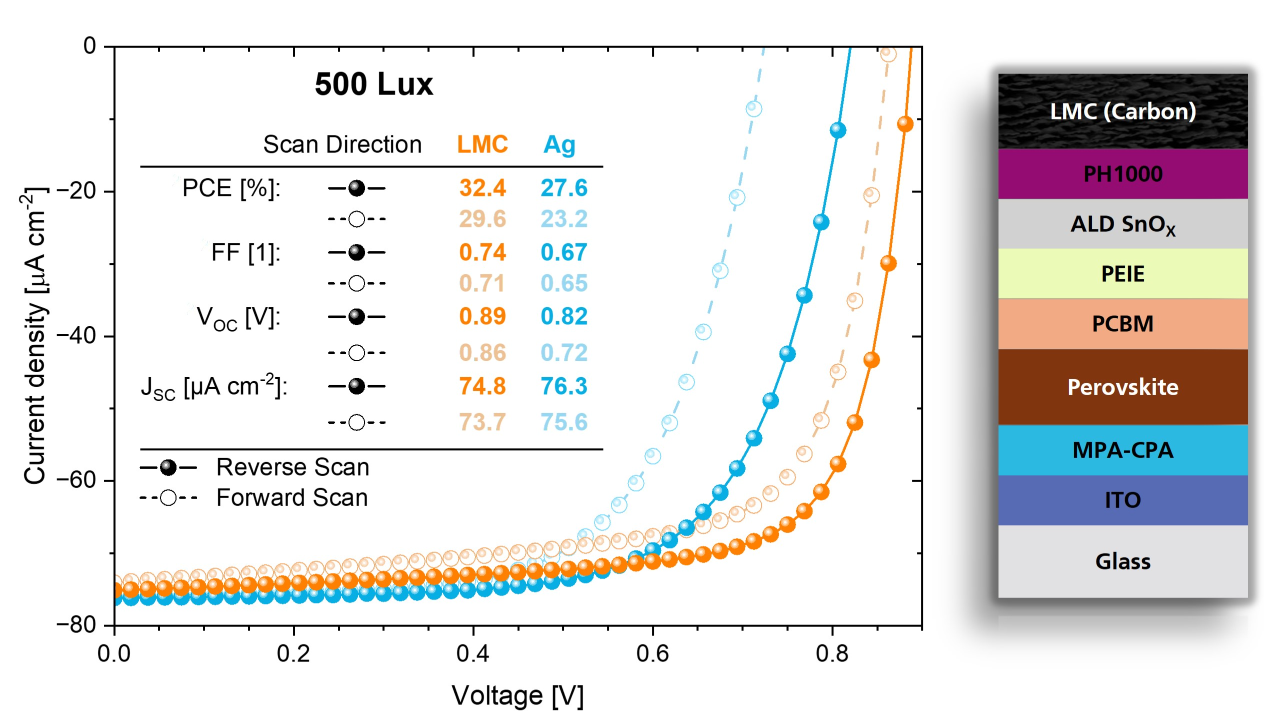 Notably, the same device design exhibits excellent performance under low-light conditions relevant for indoor photovoltaics. At an illumination level of 500 lux, the power conversion efficiency reaches 32.4%, accompanied by negligible shunt leakage. In contrast, the PSC reference employing a metal electrode achieves a PCE of only 27.8%, primarily due to pronounced losses in open-circuit voltage (VOC) and fill factor (FF). The enhanced fill factor of CPSC under low-light operation is directly linked to the PEIE/ALD SnOX combination, which improves the ETL layer uniformity, lowers the effective electron extraction barrier and suppresses space-charge-limited transport at reduced carrier densities, thereby stabilizing diode behavior under weak illumination. The combination of dipole-assisted interfacial engineering, ALD-compatible processing, and laminated carbon electrodes establishes a robust strategy for high-performance, low-light-optimized carbon-based p-i-n perovskite solar cells.