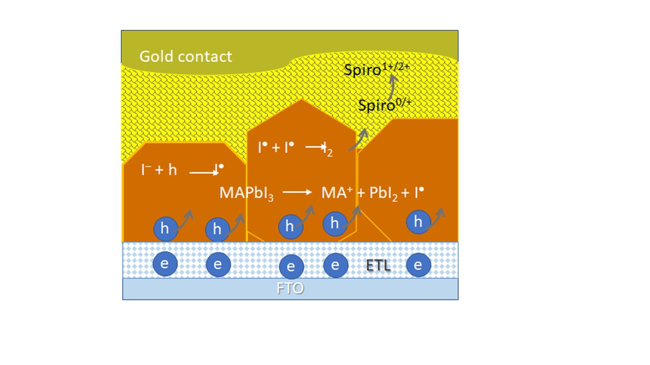Understanding processes that contribute to efficiency losses during long-term operation of perovskite solar cells is crucial for achieving operational stability. For example, photoinduced migration of halide ions and cations is known to significantly affect the device performance [1]. Under open circuit conditions, however, no current flow is allowed, therefore charge carrier recombination and charge carrier accumulation at the interfaces remain as dominating processes. Because of the possibility of charge accumulation, PSCs are susceptible to chemical transformations and undergo degradation under open circuit conditions than under MPP tracking conditions. The thermodynamic and redox properties of halide perovskites provide a strong driving force for hole trapping and oxidation of iodide species under photoirradiation.