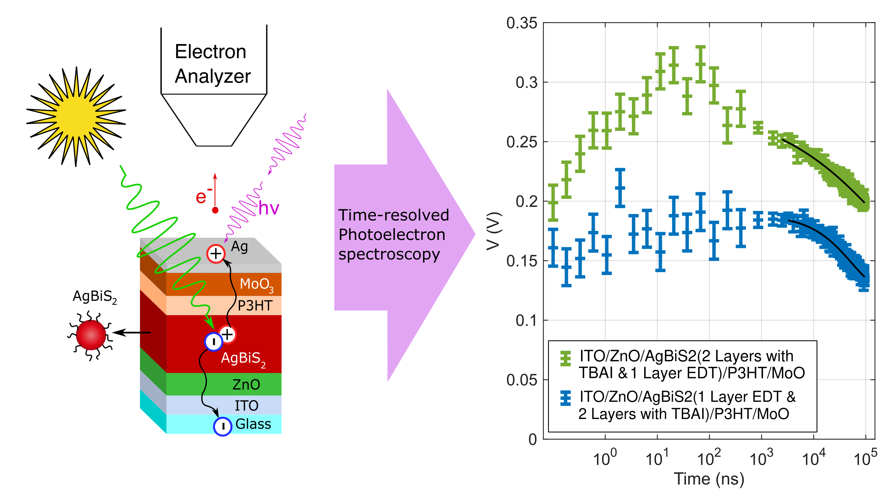 We have applied this technique to AgBiS₂ quantum dot solar cells[3] to investigate how different ligand choices and combinations affect charge transport. Four samples with different active-layer structures were studied: (I) three quantum-dot layers using EDT as the ligand, (II) three layers using TBAI, (III) one EDT-treated layer followed by two TBAI-treated layers, and (IV) the reverse sequence, with two TBAI-treated layers followed by one EDT-treated layer. The results show pronounced differences in charge-carrier separation and recombination dynamics, leading to varying photovoltage dynamics depending on the architecture. These findings provide insight into how (and why) ligand selection affects device efficiency.