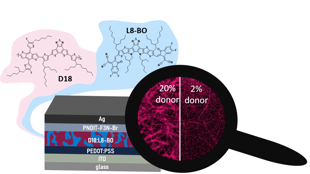 Overall, this study demonstrates that the D18:L8-BO system exhibits a high tolerance toward donor dilution, with reasonably high efficiencies maintained despite significant optical and morphological changes. Understanding donor network formation and its impact on charge generation, collection, and electrical losses provides valuable insights for optimizing organic solar cells toward high efficiency and enhanced visible light transmission, enabling new opportunities for semi-transparent photovoltaic applications. [1]