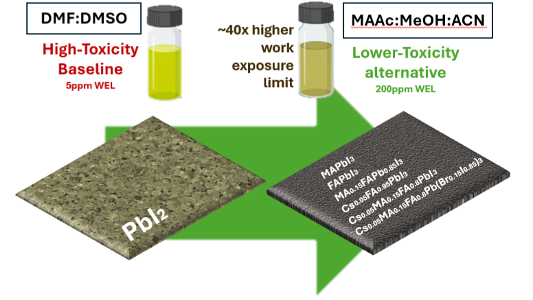 Two step deposition of lead iodide based perovskite can have many benefits as it separates the film printing from the end chemistry. This enables the formation of the film, thickness, coverage, uniformity, to be optimized separately to the end perovskite composition and morphology. The isolation of these also allows for the low-solubility lead iodide to be solubilized and deposited using relatively low toxicity solvents. In order to achieve uniform and permeable lead iodide films, DMF:DMSO is usually used. This solvent combination provides high solubility, enabling film and crystal morphology to be easily controlled using an air knife or different drying protocols.However, for scale up processes, which are often performed in open or semi-open environments, solvent extraction can become extremely difficult. As a result the toxicity, health considerations, and work exposure limits of solvents can severally hinder scale up efforts. This solvent system was identified using a combination of Hansen Solubility parameter analysis, and targeted solution trials, enabling solution stability and consistency refinement for consistent and uniform films.