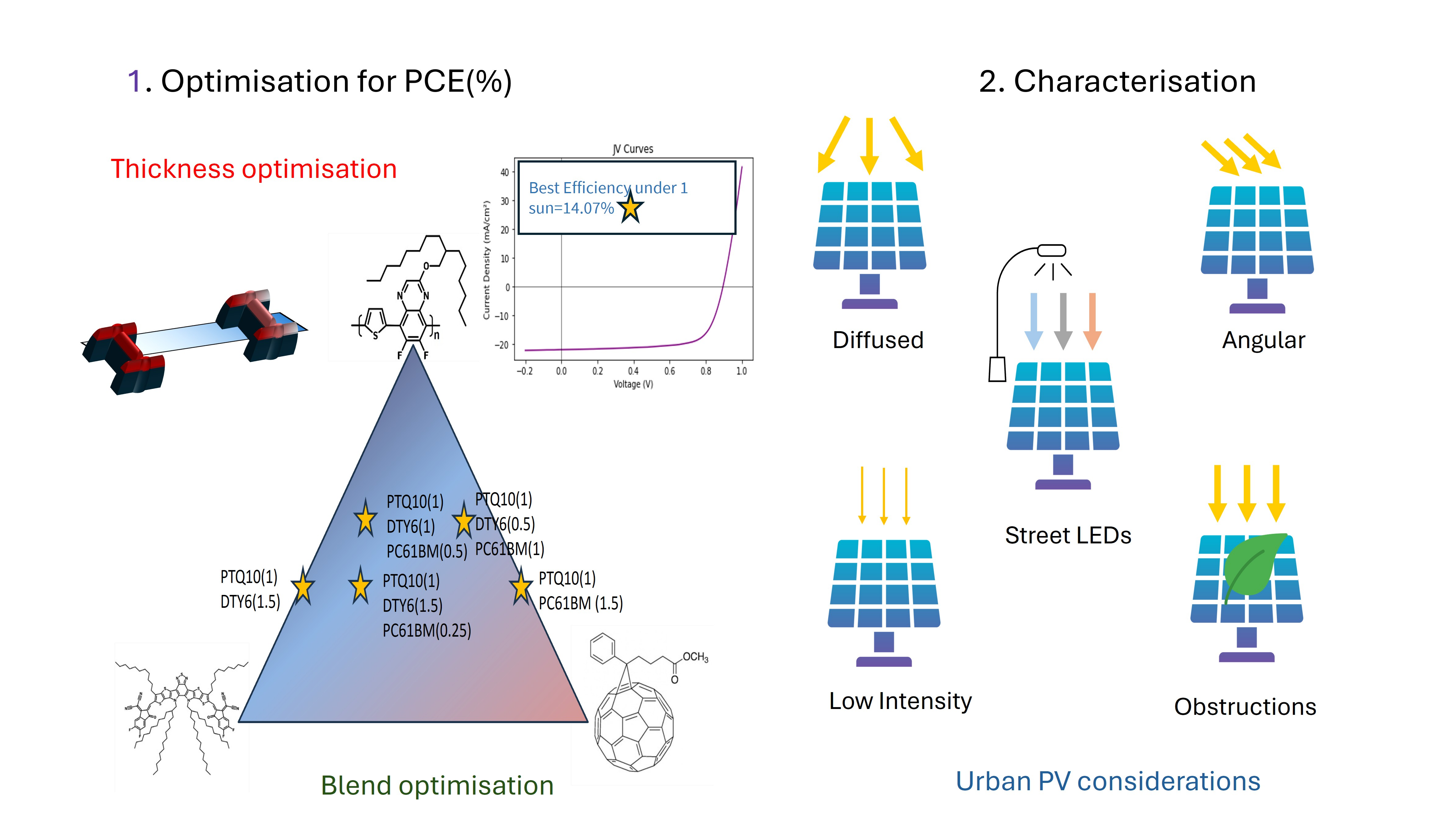 Organic Photovoltaics (OPVs) are being investigated for various applications due to their multifaceted properties[1], such as variable transparency, tunable absorption, flexibility, lightweight properties, and a low energy payback time. In this work, we focused on characterising OPV for use in urban environments, where the irradiance and spectrum can differ from standard test conditions. Given the various illumination conditions, ranging from UV to Visible to infrared, we have chosen suitable photoactive layer materials and blended them in different ratios to achieve panchromatic absorption. We then used a high-throughput methodology[2] to evaluate the best device parameters to maximise power conversion efficiency (PCE). After optimising for the PCE under standard testing conditions, major considerations for incident light on the OPV in urban environments, such as diffused and low-intensity light[3], angular dependence[4], street LED lighting[5], and vulnerabilities, such as fallen leaves on OPV modules, are tested and discussed. A ternary blend of PTQ10:DTY6:PC61BM (1:1:0.25), which exhibits broad absorption, achieves the best power conversion efficiency (PCE) of 14.07%, surpassing the 12.80% observed in the binary blend of PTQ10:DTY6 (1:1.5). We then up-scaled the devices via complete solution processing to 4.07 cm² modules, yielding a PCE of 12.22%. Our results indicate that OPVs are well-suited for deployment in urban settings. We recommend testing OPVs under various currently non-standard conditions to properly evaluate PV systems and, in addition, to develop standardised protocols for such measurements that provide a realistic picture of PV performance under varying spectral inputs.