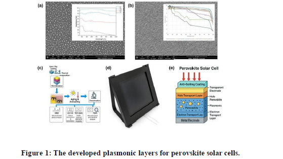 Optical measurements reveal distinct metal-dependent plasmonic behavior, with LSPR features near 500 nm and a broad spectral tail arising from nanoparticle size dispersion. As shown in Fig.1, Ag and Al nanoislands show the strongest visible-range absorption, while Au exhibits moderate enhancement. Ti-based films display broadband absorption dominated by oxide-related scattering rather than classical plasmon resonance. When integrated beneath the perovskite absorber in a planar architecture, plasmonic nanoislands enhance absorption in the 350–750 nm range, yielding visible-light enhancement of ~5–10% and relative efficiency gains up to 35.51%, depending on nanoparticle size and surface coverage. These results highlight the importance of metal selection and annealing conditions for engineering plasmonic–perovskite interfaces and enhancing light management.