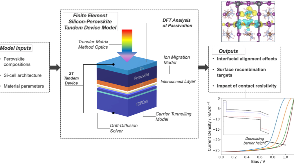 In this work, we apply finite-element device simulations to quantify the interfacial losses present in an industrially relevant perovskite-on-TOPCon architecture. We have developed a state-of-the-art perovskite-silicon tandem device model including transfer matrix method and raytracing optics, carrier tunnelling, and ion migration, coupled with a widely used drift-diffusion solver[1] to do so. We then move down the length-scales to ab-initio modelling of an experimentally demonstrated novel passivation scheme. This elucidates the atomistic mechanisms driving observed improvements in device performance and stability. Finally, we introduce the established passivation mechanism back into the device simulation to quantify the maximum possible performance improvement, setting a final target for the fully optimised interface passivation. A clear strategy for ameliorating the most critical interface identified by the device model hence emerges. Our methodology uniquely provides deep physical insight, whilst remaining broadly applicable to a range of device architectures.
