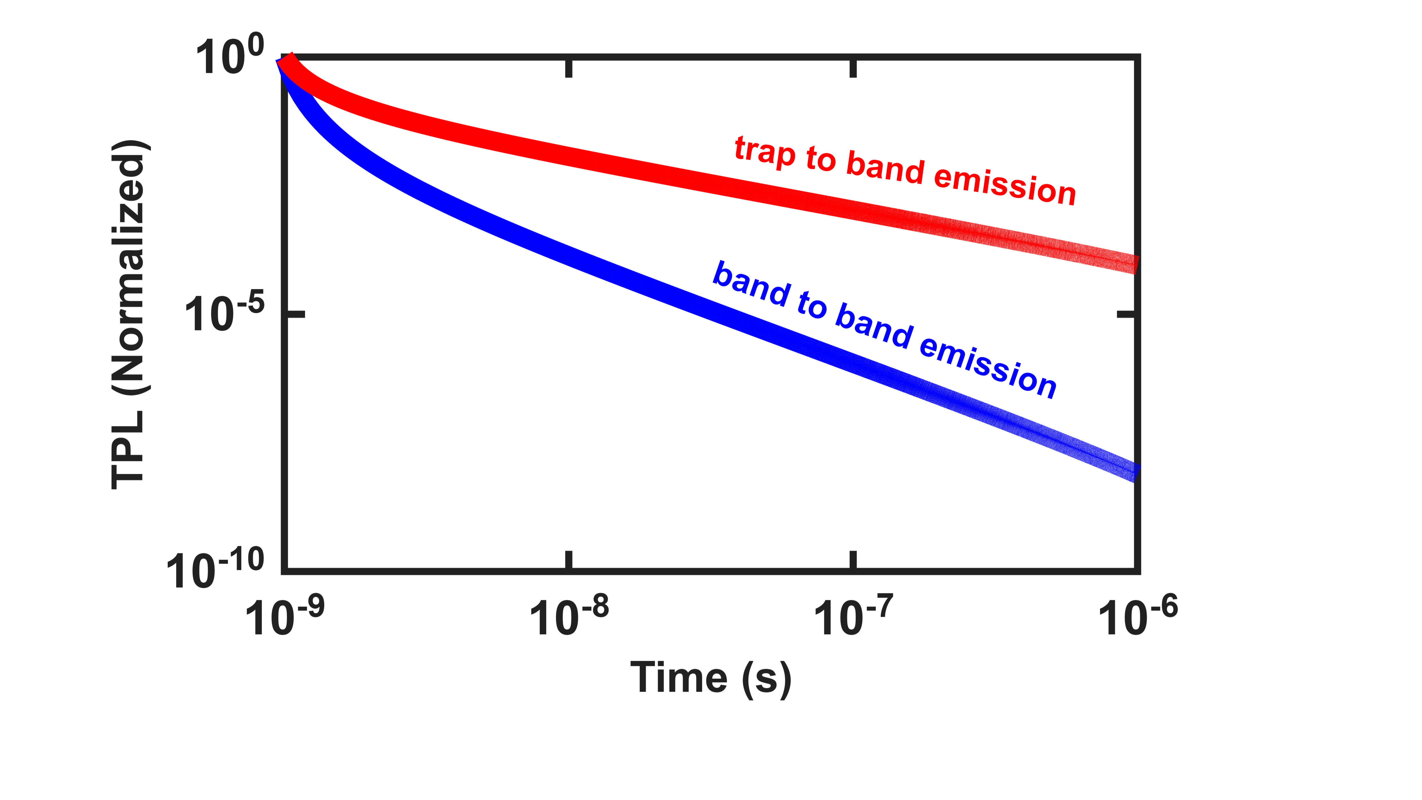 The coupled rate equations are solved under pulsed excitation conditions [4], enabling a unified and self-consistent description of both band-edge and sub-band emission within a radiative recombination framework. This model allows clear identification of the dominant recombination channels governing the observed TPL dynamics. Model-based fitting of transient photoluminescence decays quantitatively extracts band-to-band and trap-to-band radiative recombination parameters, accurately reproducing both the power-law decay of band-edge emission and the slower sub-band photoluminescence kinetics governed by trap occupancy.