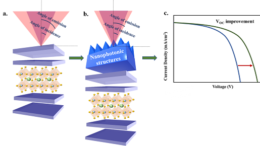 Metal-halide perovskites are one of the most promising materials for approaching and potentially exceeding the theoretical efficiency limit (Shockley-Queisser or S-Q) for solar cells owing to their structural diversity, high absorption coefficient, long carrier diffusion length and lifetime, and high carrier mobility. Various fundamental loss mechanisms in the solar cells such as thermalization, below bandgap transmission or Boltzmann losses restrict the power conversion efficiency (PCE) of devices to the theoretical S-Q limit of ~33 %. Among these, Boltzmann losses, which are linked to the large mismatch between the cones of incoming and outgoing photons of the device, have been least explored. This is partially owing to a low photoluminescence quantum yield (PLQY) in the majority of the photovoltaic materials used and the difficulty to obtain configurations that can effectively trap photons emitted by the photovoltaic material in addition to capturing sun photons. Research has demonstrated that properly engineered nanostructuring of solar cell architectures can push the maximum achievable PCE to just above 43%, by reducing the losses in open circuit voltage (Voc). Perovskite solar cells (PSCs) exhibit a notably high PLQY compared to most other photovoltaic technologies, making it an ideal candidate for targeting Boltzmann losses. In this work, we aim to utilize a unique photonics approach, which will focus on reducing Boltzmann losses and consequently improving the Voc of wide bandgap pure bromide-based FAPbBr3 PSCs. These devices show a Voc of >1.5 V in a configuration of ITO/NiOx/I-2PACz/FAPbBr3/PCBM/BCP/Ag. We apply the interfacial engineering and passivation strategies for reducing defects and obtaining high quality perovskite films with high PLQY values. Moreover, to further improve the device performance, we introduce a specifically designed photonic multilayer into the device, which can simultaneously target losses from reflections at the air/substrate interface along with reduction in Boltzmann losses.