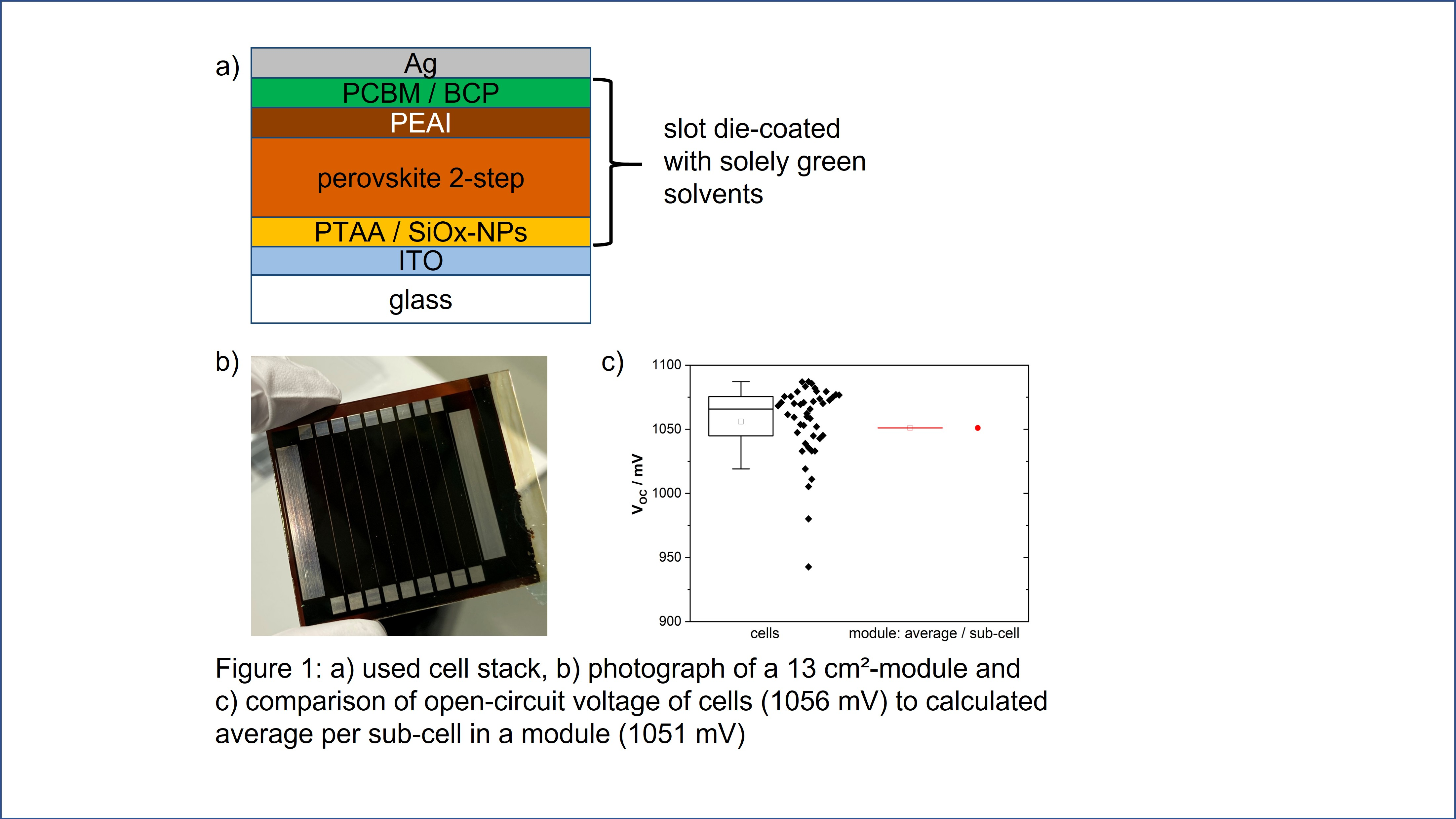 With all slot die-coated perovskite solar cells we reached power conversion efficiencies (PCE) above 16 % on an active area of 0.5 cm² with usage of solely green solvents for all layers. For 13 cm²-modules we were able to reach an average VOC over all nine sub-cells, which is comparable to that of cells from the same experiment.