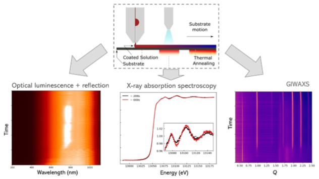 Slot-die roll-to-roll (R2R) coating represents one of the most promising scalable coating techniques for large-area flexible perovskite solar cells, however, achieving large-area films with well-controlled crystallisation kinetics and performances matching those of laboratory-scale, spin-coated films remains a significant challenge.[1] Here, we employ our custom-designed beamline-integratable roll-to-roll slot die coater combined with simultaneous, multimodal in-situ characterisation, including X-ray diffraction (XRD), X-ray absorption spectroscopy (XAS), X-ray fluorescence (XRF) and optical spectroscopy. This integrated approach enables complementary, real-time in-situ investigation of crystallisation phase, local structure, chemical composition, lead oxidation state and electronic properties during film formation.