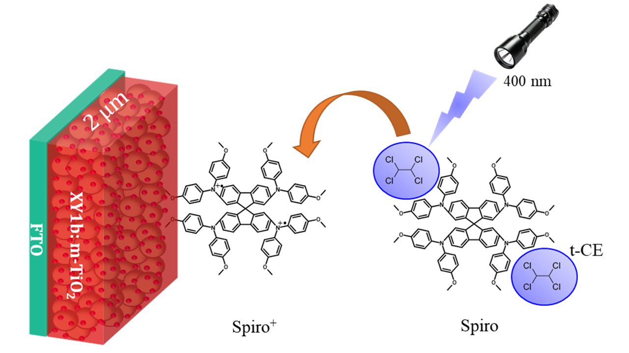 Spiro-OMeTAD is widely regarded as a benchmark and reference hole-transport material (HTM) for solid-state dye-sensitized solar cells (ss-DSSCs)[1]. However, excessive oxidation of spiro-OMeTAD (formation of spiro²⁺/³⁺/⁴⁺ species) caused by uncontrolled exposure to oxygen significantly limits the hole mobility within the HTM layer, thereby limiting the device performance. Consequently, precise control over the oxidation state of spiro-OMeTAD using an oxygen-free chemical doping strategy is crucial for achieving efficient ss-DSSCs. Here, we report a rapid and controlled oxidation of spiro-OMeTAD in solution using 1,1,2,2-tetrachloroethane (t-CE) as a p-type chemical dopant[2]. Upon UV activation at 400 nm, t-CE enables the generation of spiro⁺ species by adjusting the irradiation time and dopant concentration. This approach avoids conventional slow ambient oxidation, allowing rapid and reproducible device fabrication. As a result, ss-DSSCs fabricated with the XY1b dye and t-CE-doped spiro-OMeTAD exhibit an enhanced power conversion efficiency (PCE) of 6.24%, compared to 5.94% for control devices without t-CE. Dye regeneration efficiency and photo-induced Stark effect were systematically investigated using photoinduced absorption (PIA) spectroscopy[3]. Furthermore, the balance between charge transport and interfacial electron–hole recombination was found to depend strongly on the concentration of spiro⁺ species participating in transport kinetics. Optimization of this balance leads to improved device performance, particularly under low-intensity indoor lighting conditions and realized the device PCE up to ~15%.