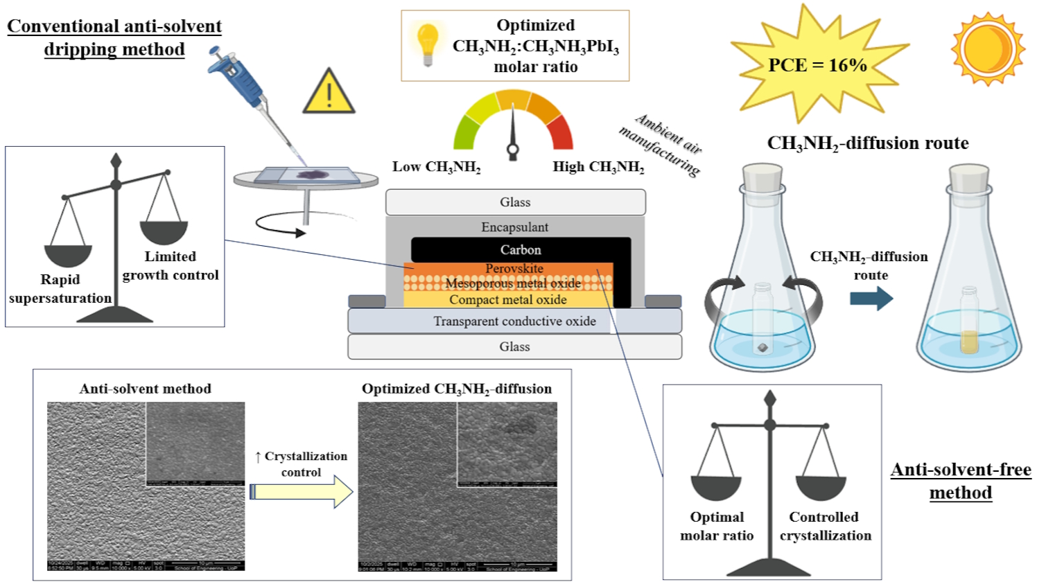 Perovskite solar cells (PSCs) have nowadays demonstrated remarkable power conversion efficiency (PCE), exceeding 27% in lab scale. However, their scalable manufacturing under ambient conditions remains a significant challenge, with anti-solvent quenching of perovskite precursor wet film to be considered an integral manufacturing step for attaining high-quality perovskite active layers. In parallel, the conventional noble-metal hole-transport-layer-based (HTL-based) architectures of perovskite photovoltaics are the main designs to enable the record efficiencies, but yet incompatible with large-scale manufacturing. As an alternative, the carbon-based HTL-free design is considered the frontrunner to the photovoltaics market, providing lower performance but significantly higher stability, cost-effectiveness and full compatibility with printing processing on an industrial level. The present work deals with the development of single-crystal-derived perovskite precursor inks and their solution chemistry optimization to attain high performance in n-i-p carbon-based HTL-free solar cells without an anti-solvent processing step. More specifically, methylamine (CH3NH2)-diffusion route is employed to engineer the perovskite precursor solution to control phase transformation of the 3D black single-crystal perovskite into a clear, yellow, viscous liquid intermediate, preserving structural coordination, avoiding full decomposition into a random ionic solution. By optimizing this intermediate-phase through systematic tuning of the CH3NH2:CH3NH3PbI3 molar ratio, the intermediate-phase chemistry, nucleation and crystallization kinetics are controlled, leading to uniform, pinhole-free perovskite films, with μm-sized grains under ambient air. To this end, ambient-air processed C-based HTL-free PSCs with PCEs up to 16% and with enhanced stability are fabricated. Notably, the unencapsulated devices show a remarkable stability under dark storage aging (ISOS-D-1 protocol conditions), surpassing the limit of 1000 h of aging without detecting any degradation in their light-to-electricity conversion efficiency. This work elucidates the fundamental role of intermediate-phase chemistry in perovskite precursor inks and establishes a robust, antisolvent-free pathway toward highly efficient and stable PSCs manufacturing under ambient conditions.