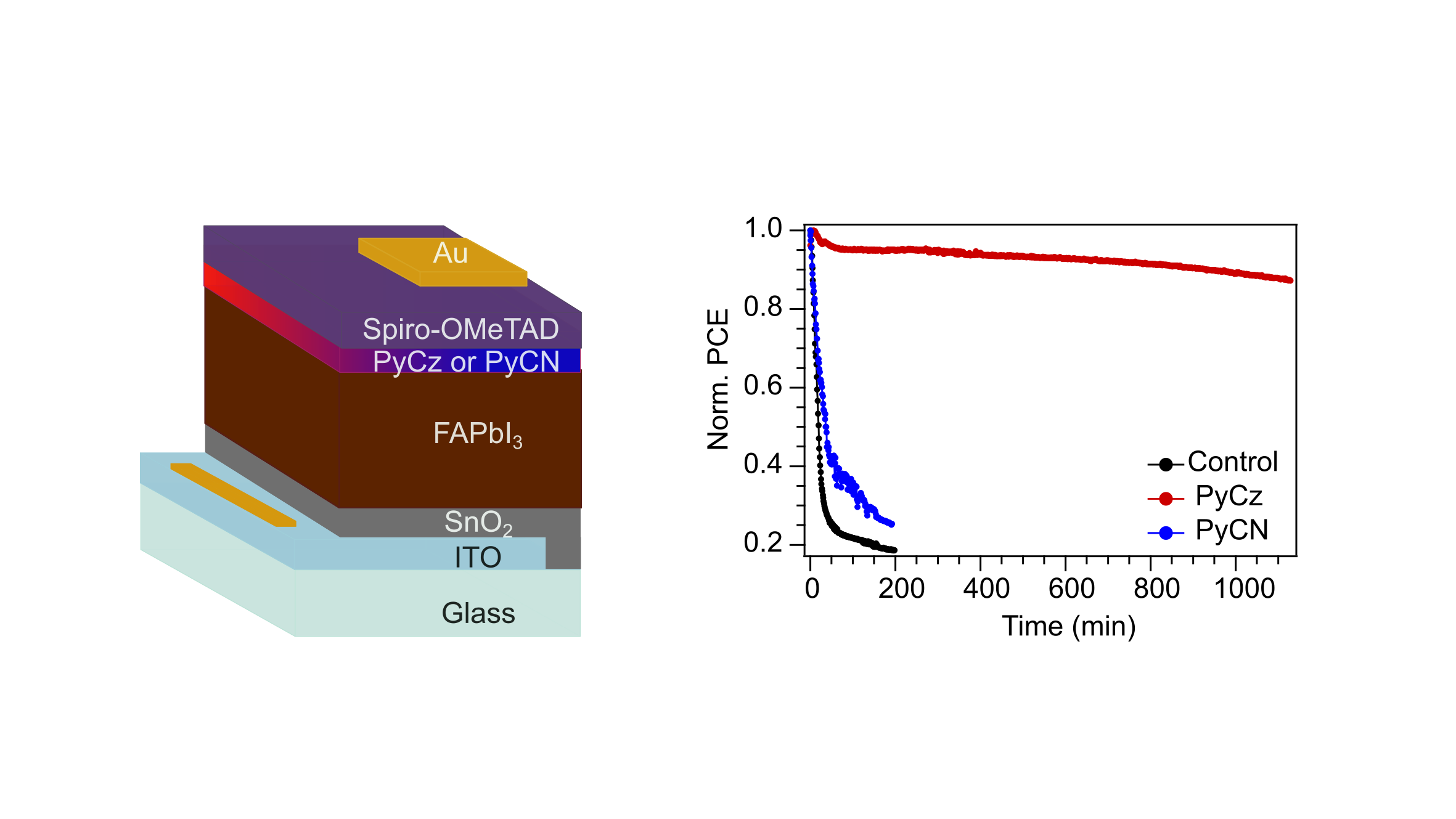Both molecules contain carbazole donor and a cyanopyridine acceptor core, providing Lewis base sites for defect passivation and favourable energy level alignment for hole extraction.[3] While only marginal improvements in Voc, Jsc, and fill factor were observed, a pronounced enhancement in operational stability was achieved, particularly for PyCz-modified devices. Unencapsulated PSCs with PyCz interfacial layer retained ~90% of their initial efficiency after 1120 minutes of continuous one-sun illumination under ambient conditions (<40% RH), compared to only 8% and 15% retention for control and PyCN-treated devices, respectively.