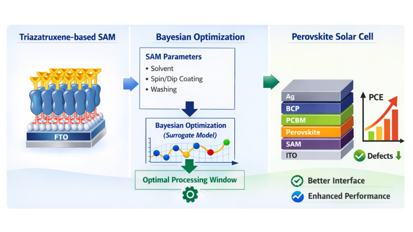 Self-assembled monolayers (SAMs) have emerged as a pivotal strategy for enhancing energy level alignment and mitigating interfacial defects in p-i-n perovskite solar cells (PSCs).1-2 However, identifying the optimal deposition conditions for novel SAM molecules often requires extensive and time-consuming experimental trials. This study presents a systematic, data-driven optimization of the deposition process for a triazatruxene-based SAM on transparent conductive substrates. To navigate the complex, multi-dimensional parameter space—including solution concentration, solvent systems, and thermal annealing—we employed Bayesian optimization to guide the experimental workflow. A surrogate model, iteratively refined through experimental feedback, effectively mapped the relationship between processing parameters and device performance. Initial optimization cycles led to a maximum power conversion efficiency (PCE) of 15.9%, demonstrating the efficiency of the model in identifying promising processing windows with minimal experimental iterations. The chemical anchoring of the SAM to the substrate was confirmed via X-ray photoelectron spectroscopy (XPS). Furthermore, steady-state and time-resolved photoluminescence (PL/TRPL) measurements revealed significantly improved charge extraction dynamics and reduced non-radiative recombination at the SAM/perovskite interface compared to non-optimized devices. These results highlight that Bayesian optimization offers a powerful and scalable methodology for accelerating the development of high-performance interfacial layers in next-generation photovoltaics.