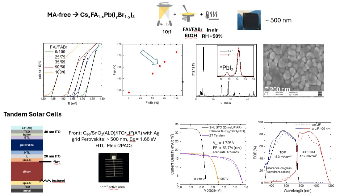 A composition with 1.66 eV bandgap, optimal for tandem integration, was implemented in p-i-n perovskite solar cells on glass/ITO substrates using PTAA or MeO-2PACz as hole transport layers and thermally evaporated C60 as electron transport layer. Additive engineering and process optimization were explored to enhance film uniformity, reproducibility and device performance.