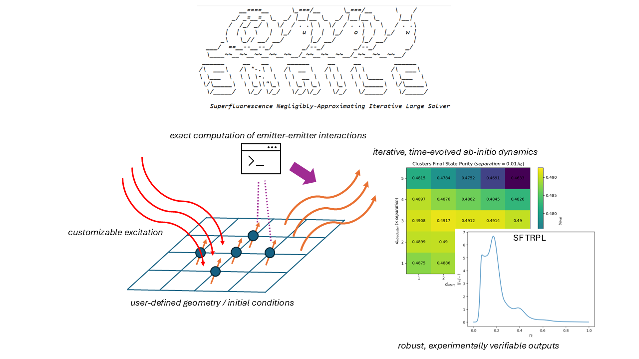 While the model allows for the user-defined arrangement of emitters, there is currently progress being made in creating unit cell structures simulating perovskite quantum dots (QD), which will enable the study of superfluorescence dynamics and coherence buildup in perovskite QD systems. This facilitates straightforward experimental validation using existing measurement techniques in perovskite systems, and may also be used to advance our understanding of superabsorption and its role in enhancing the efficiency of perovskite QD photovoltaics6.