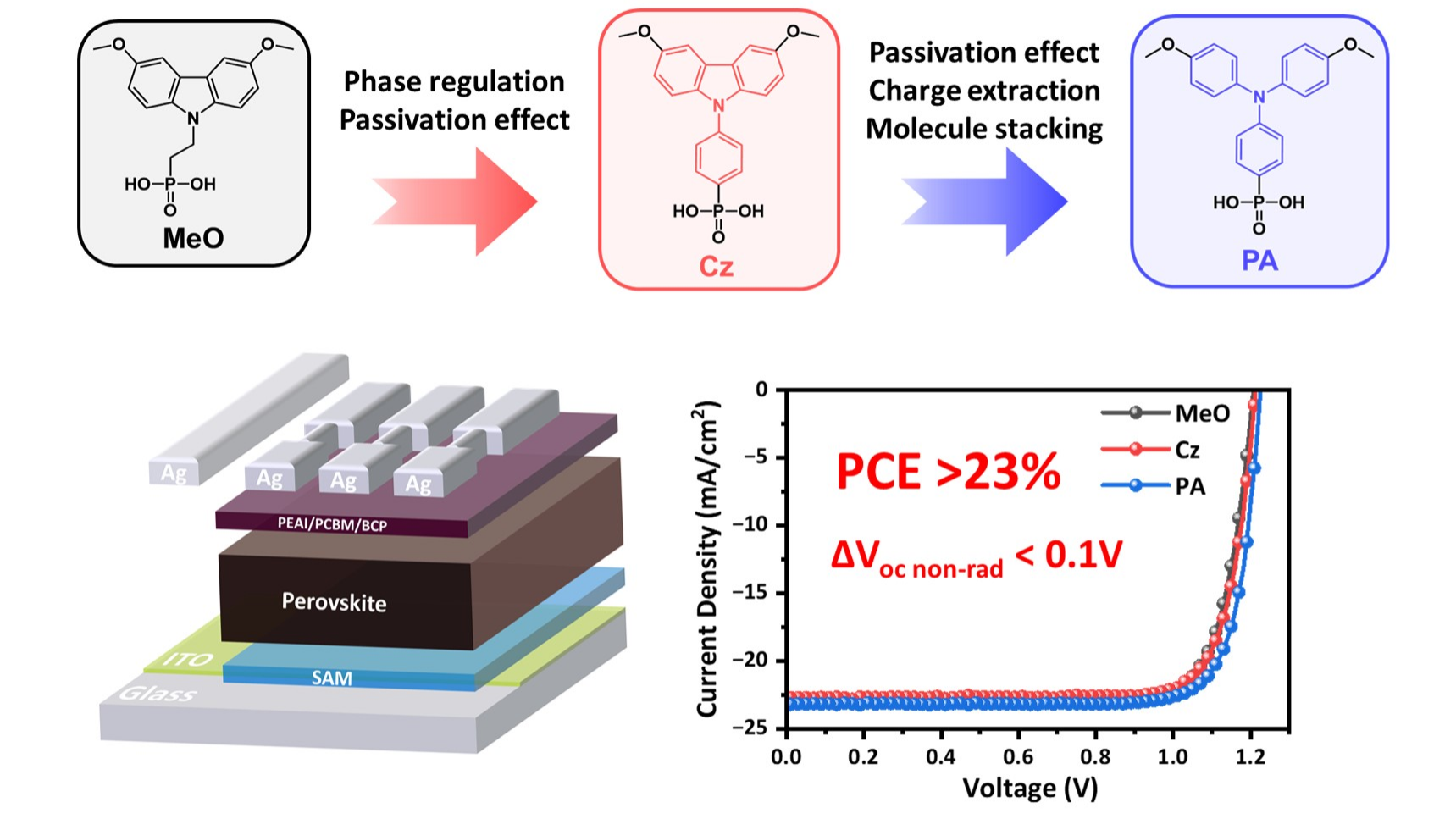 Self-assembled monolayers (SAMs) have emerged as an important area of research for enhancing the efficiency of inverted perovskite solar cells (PVSCs) through improved hole extraction and interfacial passivation. SAMs based on carbazole and various alkyl linkers (e.g., MeO-2PACz and Me-4PACz) have been extensively studied for their potential as commercial SAMs. Recently, researchers have designed innovative SAMs with multifunctionality to enhance charge transport properties and interfacial contacts to simultaneously improve PVSC performance and stability.