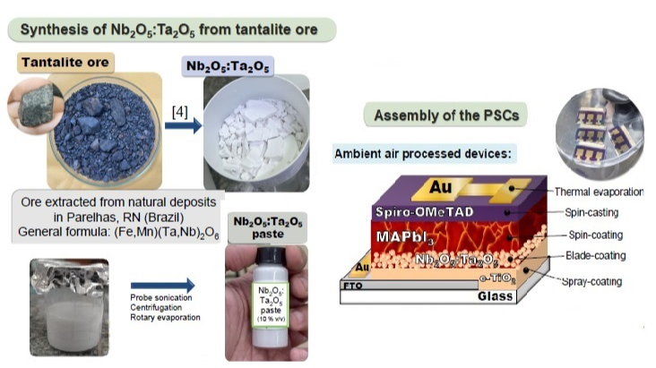 Perovskite solar cells (PSCs) have rapidly advanced as a leading photovoltaic technology due to their high-power conversion efficiency and low fabrication costs. As this photovoltaic technology is now approaching deployment [1], the use of materials and processes based on abundant and locally available precursors becomes even more important, to ensure competitiveness and strategic leadership in this technological field. In Brazil, the discovery of natural reserves of columbite and tantalite minerals in recent decades has sparked interest on the development of extraction and processing routes to explore these ores [2], and on adding value to elements extracted from them, such as niobium and tantalum. Nb and Ta have similar physical and chemical properties, thus these elements tend to be found together in nature, being both of them present in columbite and tantalite ores. In this context, we explored the use of niobium and tantalum mixed oxides processed from the natural tantalite ore, and their application as a potential selective contact (ETL) for PSCs, aiming to combine functional performance with material abundance and scalability. The ETL must offer high transparency, suitable energy level alignment, and adequate electronic properties. Usually, in PSCs with the n-i-p structure, the ETL is based on SnO2 or TiO2 layers [3], but Nb2O5 has also been successfully applied in that layer [4]. Herein, we present the purification process employed to extract the Nb/Ta oxides from tantalite ore collected in natural deposits in Parelhas, RN (Brazil), and a full investigation of their structural, morphological, and electronic properties. Based on the characterizations of the obtained niobium/tantalum oxides, as well as heat treatments performed at different temperatures, we obtained a powder material that was further processed tom form inks, which were then used to prepare the ETL layer in n-i-p PSCs, achieving a PCE of 16.71%. To our knowledge, this is the first demonstration of the use of mixed niobium/tantalum oxide in PSCs.