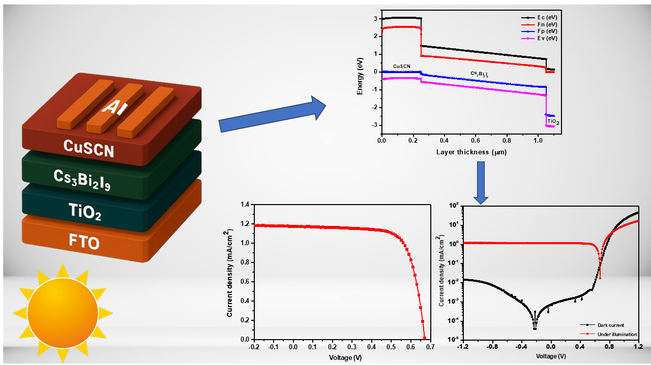 Overall, this study presents a comprehensive exploration of Cs₃Bi₂I₉-based perovskite solar cells by combining numerical modeling with experimental fabrication and characterization. The results not only demonstrate the feasibility of a new device structure but also highlight the importance of addressing interface defects and recombination losses in improving performance. By showcasing both the opportunities and challenges of Cs₃Bi₂I₉ as an absorber material, this work contributes to the ongoing development of eco-friendly, stable, and scalable lead-free perovskite photovoltaics, paving the way for next-generation solar cell technologies.