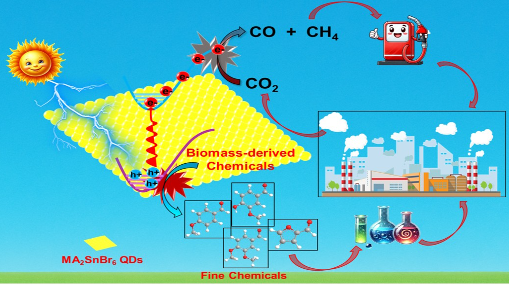 Hybrid halide perovskites (HHPs), whose every branch generates intrusiveness, have been utilized in solar cells from a wider perspective. However, the inclusiveness of employing HHP as a photocatalyst is still in its initial stage. We have explored the so far undesirable material, MA2SnBr6 synthesized from MASnBr3 and discovered a new vacancy-ordered MA2SnBr6 perovskite as a potential photocatalyst for efficient solar-driven C(sp3)─H activation of cyclohexane and toluene under ambient conditions. The as-synthesized MASnBr3 and its oxidized form having different ratios of Sn2+ and Sn4+ were subjected to cyclohexane oxidation and it was observed that the completely oxidized form i.e. MA2SnBr6 gave the highest yield of cyclohexanol and cyclohexanone.1 Further, we have addressed four major key challenges in the domain of halide perovskites i.e. toxicity, stability, reusability, and efficiency of halide perovskites. To tackle these issues, we synthesized a vacancy-ordered HHP, specifically methyl ammonium tin bromide quantum dots (MA2SnBr6 QDs) directly from its raw precursors this time, which had not been explicitly synthesized so far. MA2SnBr6 was synthesized through a greener approach, a simple yet effective solvent-free mechanochemical synthesis at room temperature without the use of additional capping agents. Interestingly, the synthesized MA2SnBr6 QDs exhibit stability in air and moisture, addressing a common issue with HHPs. Surprisingly, we also discovered that these MA2SnBr6 QDs are stable in polar solvents such as isopropanol, ethanol, and acetonitrile, overcoming a major challenge typically encountered with halide perovskites. The air and moisture-stable MA2SnBr6 QDs were applied for photocatalytic CO2 conversion. The icing on the cake is the simultaneous conversion of biomass-derived alcohol to valuable chemicals which was not attempted previously with CO2 reduction. The yield of the CO and CH4 is higher than the so far reported perovskite used for photocatalytic CO2 reduction.2 Moreover, compared with the complex photocatalytic system previously reported, our single catalytic (MA2SnBr6) system presented impressive results for simultaneous biomass-derived alcohol oxidation with CO2 reduction.