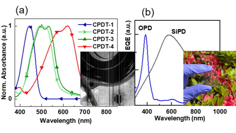 Recent studies on organic and perovskite optoelectronic devices have primarily relied on solution processing. However, from the perspective of commercialization, the vacuum-deposited process is more feasible because the representative OLED industry is based-on vacuum-deposition process.[1] First, we present the development of wavelength-selective organic small molecules from UV to Red with their application in high-performance optical sensors. For narrowband UV selective organic photodetectors (OPDs), three thiazolothiazole-based small molecules were synthesized as an active layer donor.[2] The extended π-conjugation and highly planar backbone was important to improve the intermolecular ordering and efficient charge transport even in the evaporation with C60 acceptor. The resulting OPDs exhibited high responsivity and detectivity with ultrafast response times and a cutoff frequency. Moreover, the devices were successfully monolithically integrated with CMOS image sensors, enabling multifunctional imaging without resolution loss. For R/G/B wavelength selective OPDs, a series of cyclopentadithiophene-based donor molecules were designed for tuning absorption from blue to red while maintaining low molecular weights and thermal stability suitable for vacuum deposition.[3] When blended with C60, a green-selective donor exhibited outstanding performance with external quantum efficiency (EQE) up to 70% and specific detectivity of 2.5 × 10¹² Jones. These devices demonstrated practical applications in visible-light communication and high-resolution X-ray imaging. Seceond, we report novel bathocuproine (BCP) derivatives for cathode buffer layer in perovskite solar cells (PSCs). Substituting phenyl and p-tolyl groups at the 2,9-positions on BCP improves molecular planarity, protects reactive sites, which significantly enhances charge transport, reduces recombination losses, and markedly improves the structural stability of PSCs.[4]