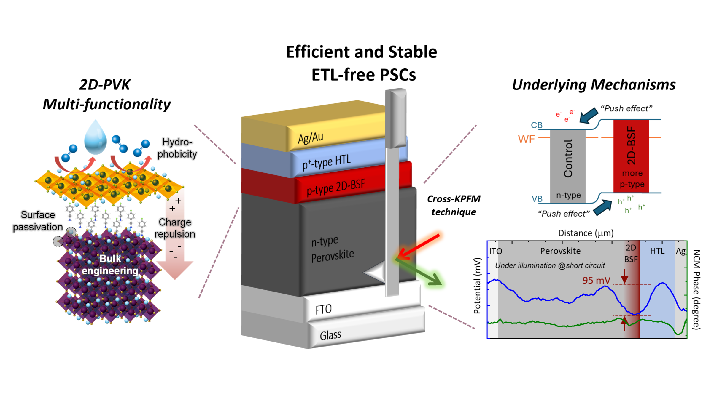 Electron-transport-layer-free (ETL-free) perovskite solar cells (PSCs) combine structural simplicity with high efficiency, making them ideal for tandem applications as top cells. While most efforts have improved performance by modifying the fluorine-doped tin oxide (FTO)/perovskite interface, the role of the perovskite/hole transport layer (HTL) interface has been largely overlooked. Here, we enhance charge collection in ETL-free PSCs by tuning the internal electric field through both bulk perovskite optimization and interface engineering [1]. Using excess PbI₂ doping and annealing to control carrier properties, we improve the perovskite’s electronic behavior. A multifunctional 2D-perovskite interlayer further passivates surface defects and introduces a built-in electric field, similar to the n/p/p⁺ back-surface field found in silicon solar cells. Cross-sectional Kelvin probe force microscopy (KPFM) reveals the mechanism of this interfacial field. The optimized devices reach a record 22.47 % power conversion efficiency, without any FTO modification or extra interlayers, and retain 75 % of their performance after 1100 hours in a humid (≈50 ± 5 % RH) dark environment. This work demonstrates a practical route toward efficient, durable, and scalable ETL-free perovskite solar cells.