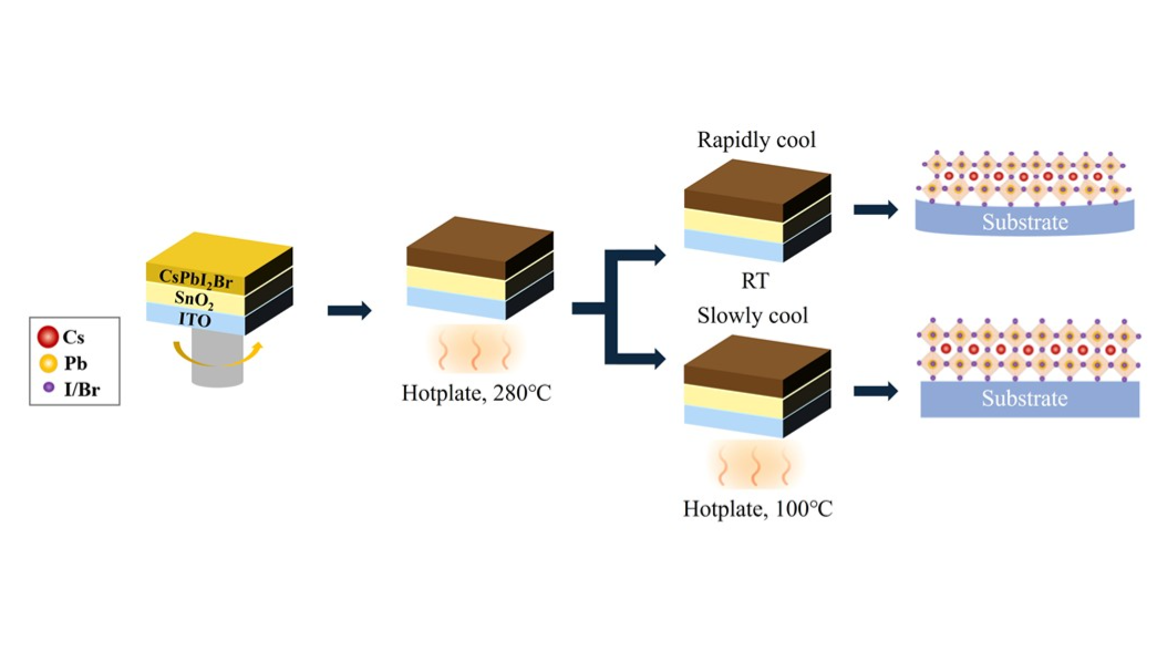 All-inorganic CsPbI₂Br perovskite solar cells suffer from interfacial defects and stress-induced instability that limit their performance. [1] Herein, we systematically investigate how annealing parameters—atmosphere, duration, and cooling rate—govern defect formation and stress evolution. Moderate air annealing promotes the formation of Pb–O bonds, effectively passivating surface Pb²⁺ defects and increasing the open-circuit voltage (VOC) to 1.31 V. [2], [3] However, excessive oxidation results in residual compressive stress, which accelerates structural degradation and performance loss during storage. By introducing a slow-cooling process, lattice relaxation is facilitated and the internal stress is reduced from 50.4 MPa to 31.1 MPa, resulting in devices with a power conversion efficiency of 15.3%, fill factor of 80.8%, and remarkable long-term stability, retaining over 95% of the initial efficiency after 600 hours. These findings highlight that a well-balanced combination of oxidation and thermal stress engineering is critical for achieving high-performance and stable CsPbI₂Br photovoltaics.