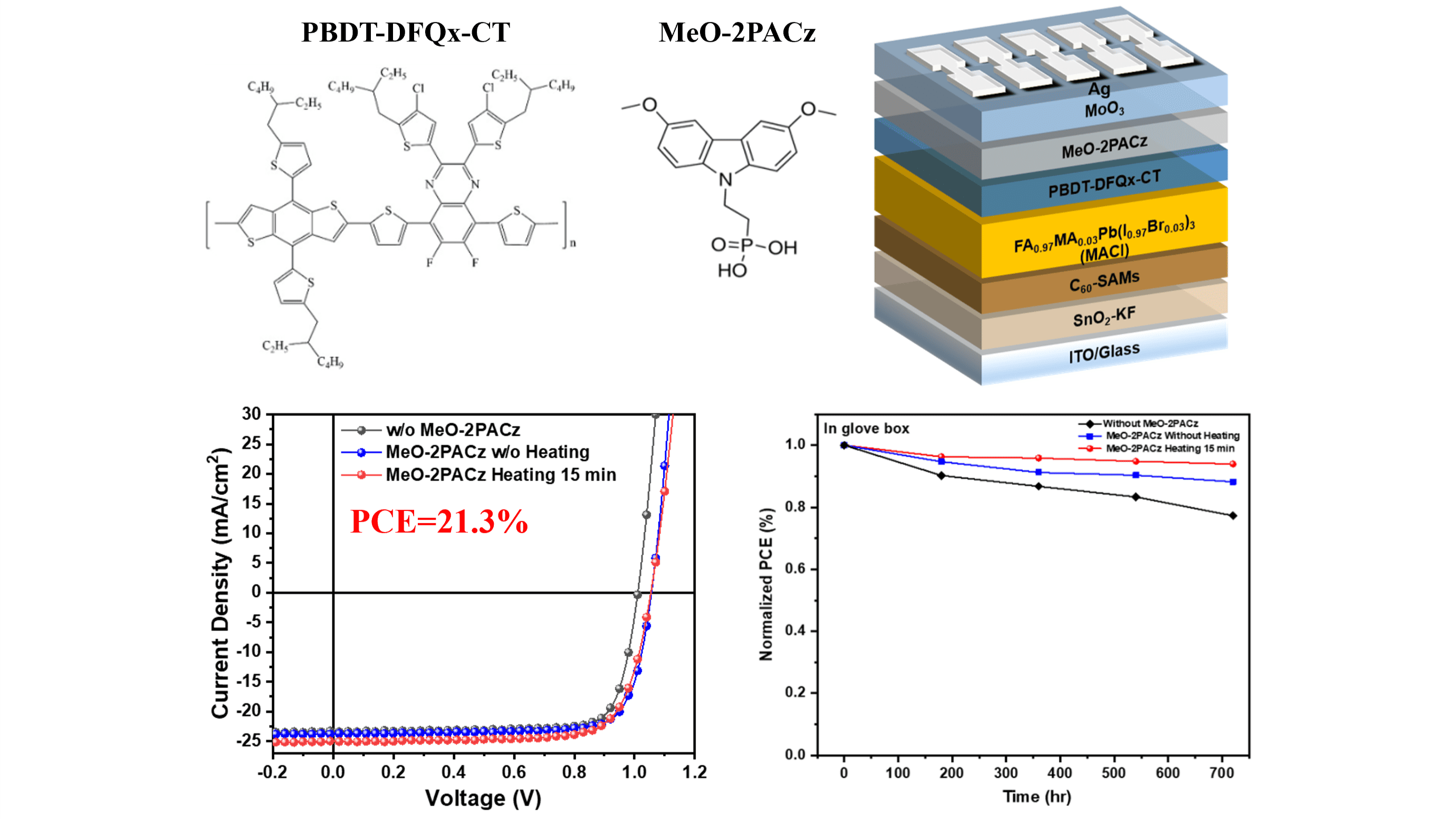 To solve these issues, a series of donor-acceptor (D-A) copolymers were developed as dopant-free HTMs. A composite HTL composed of PBDT-DFQx-CT and MeO-2PACz was employed, and thermal treatment was used to promote the self-assembled monolayer (MeO-2PACz) to bond effectively with MoO3, improving molecular ordering and interface quality. The resulting FA0.97MA0.03Pb(I0.97Br0.03)3-based n-i-p perovskite solar cell achieved a power conversion efficiency of 21.3%, with an open-circuit voltage (Voc) of 1.07 V, short-circuit current density (Jsc) of 25.0 mA/cm2, and a fill factor (FF) of 79.3%. Furthermore, the device retained over 90% of its initial efficiency after 700 hours of storage, demonstrating remarkable operational stability. This work provides new insights into the design of dopant-free HTLs for efficient and stable n-i-p perovskite solar cells.