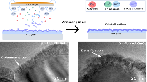 The predominant solution-based methods for depositing SnO2 films include chemical bath deposition (CBD) and colloidal dispersions.[12-15] Moreover, the ultrathin nature of these films (15–30 nm) makes them prone to pinhole formation, while CBD often requires long reaction times and yields films with uncontrolled oxygen vacancies.[16-18] To address these limitations, vacuum-based techniques such as radio-frequency (RF) magnetron sputtering have gained attention for producing uniform, stoichiometrically controlled SnO₂ layers. This solvent-free process allows the precise control over thickness and composition via sputtering power, deposition pressure, and O₂/Ar ratio.[19, 20]