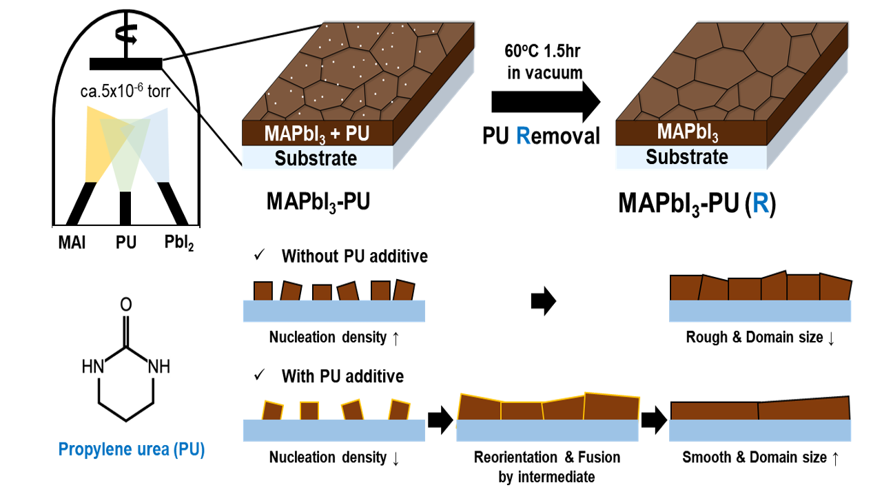 In this study, we present a novel method for controlling the growth of perovskite crystals in a vacuum thermal evaporation process by utilizing a vacuum-processable additive, propylene urea (PU). By co-evaporating perovskite precursors with PU to form the perovskite layer (Figure1), PU, acting as a Lewis base additive, retards the direct reaction between the perovskite precursors. This facilitates larger domain size and reduced defect density. Following the removal of the residual additive, the perovskite layer, exhibiting improved crystallinity, demonstrates reduced charge recombination, as confirmed by time-resolved microwave conductivity analysis. Consequently, there is a notable enhancement in open-circuit voltage and power conversion efficiency, increasing from 1.05 V to 1.15 V and from 17.17% to 18.31%, respectively. The incorporation of a vacuum-processable and removable Lewis’s base additive into the fabrication of vacuum-processed perovskite solar cells offers new avenues for optimizing these devices. This strategy can be extended to other vacuum-processed perovskite compositions and multilayer device architectures, enabling broader applicability of additive engineering in scalable fabrication.