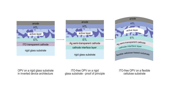 Organic solar cells (OPVs) require at least one transparent electrode. The most commonly used transparent electrode is Indium Tin Oxide (ITO) due to its high optical transparency and electrical conductivity as well as chemical resistance. However, ITO is brittle and susceptible to cracking when being bent. Additionally, ITO is incompatible with roll-to-roll processing techniques. Since our goal is to fabricate OPVs on flexible and large-scale wood-based substrates, it is necessary to find an alternative transparent electrode. We have successfully demonstrated an ITO-free OPV on glass and PET with a semi-transparent silver thin film electrode through physical vapor deposition. ZnO nanoparticles were deposited before and after evaporation via spin coating, to modify the optical properties of the silver and function as the electron transport layer (ETL). The OPVs show good open-circuit voltage and fill factor, although the short-circuit current decreases due to the semi-transparent nature of the Ag thin film bottom electrode. Current progress is being made in reproducing the technique on cellulose nanofiber sheets, transparent wood and bacterial cellulose substrates.