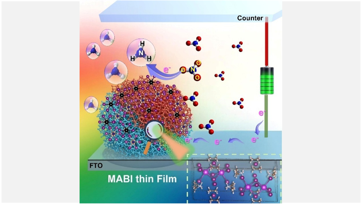 Metal halide perovskites (MHP) have emerged as an apposite semiconductor material for various optoelectronic devices such as solar cells, photodetectors, capacitors, sensors etc. Despite the ample possibility, metal halide perovskites including bismuth have not been explored for NH3 production. We have utilized bismuth-based perovskites as an electrocatalyst for reduction of nitrate to ammonia. We report fabrication of methylammonium bismuth iodide ((CH3NH3)3Bi3I9) MABI) thin film directly on fluorine doped tin oxide (FTO) substrate and detailed structural, morphological and optical properties of the thin film reveal the formation of interconnected pure hexagonal structure with band gap of ~ 2.1 eV. The as-fabricated MABI thin film showed outstanding ammonia yield (27.53 µg mg⁻¹ h⁻¹) under atmospheric conditions with exceptional Faradic efficiency (40%). This work not only describes direct conversion of nitrate to ammonia under mild conditions employing lead-free non-toxic MABI but also, use of nitrate ions which are carcinogenic to human beings and major water pollutants as nitrogen source. Thus, in addition to green ammonia production this electrocatalytic process also paves the way to control nitrate pollution. The findings demonstrate the potential of hybrid halide bismuths in addressing the dual challenges of energy efficiency and environmental sustainability in nitrogen fixation. Future work focusing on the optimization of structural properties and scalability could further advance the practical applications of this material in green ammonia synthesis. This study paves the way for the exploration of novel lead-free perovskite materials in catalytic systems, contributing to the global shift towards sustainable chemical processes and a potential technology for low temperature, low pressure ammonia production.