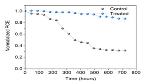 This study elucidates the role of phenolphthalein (PHTH) as an additive in enhancing the photovoltaic performance and operational stability of formamidinium lead iodide (FAPbI3) perovskite solar cells (PSCs) fabricated under ambient conditions. Incorporation of PHTH into the perovskite precursor solution markedly improved the film quality and device performance. At an optimal concentration of 10 mg mL⁻¹, the power conversion efficiency (PCE) increased from 14.6 % to 19.9 %, accompanied by negligible hysteresis. Furthermore, the PHTH-modified PSCs retained approximately 90 % of their initial efficiency after 720 h of storage in air (25 oC, 30 % relative humidity), whereas the control devices degraded to ~30 % under identical conditions (Figure 1). The superior performance is attributed to the dual functionality of PHTH: it acts as a molecular adhesive promoting the formation of highly ordered FAPbI3 crystals, and as an O-donor Lewis base that coordinates with Pb2+ and FA+ ions. These interactions suppress non-radiative recombination and facilitate the phase transformation from the non-perovskite δ-phase to the photoactive a-phase. This work demonstrates that PHTH is an effective molecular additive for achieving high-efficiency, air-stable FAPbI3-based PSCs[1].