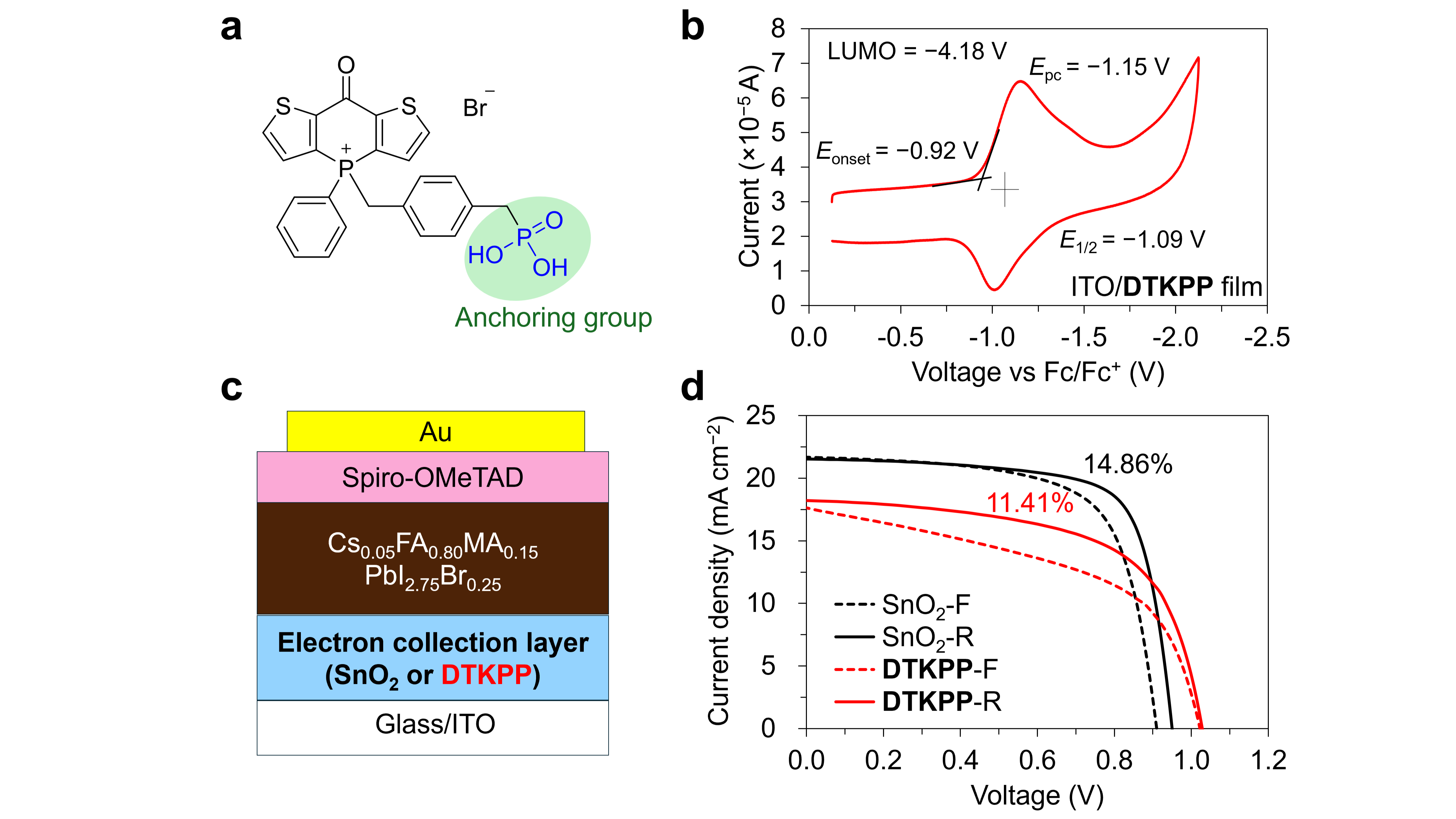 In this study, we synthesized dithieno-4-keto-1,4-dihydrophosphinine[3]-based phosphonium salt bearing a phosphonic acid anchoring group (DTKPP) (Figure 1a). Electrochemical analysis estimated the LUMO level to be −4.18 eV (Figure 1b). This level is deeper than the Conduction Band Minimum (CBM) of the reference lead perovskite (Cs0.05FA0.80MA0.15PbI2.75Br0.25, CBM: −3.99 eV [4]), confirming a favorable energy offset for efficient electron extraction.