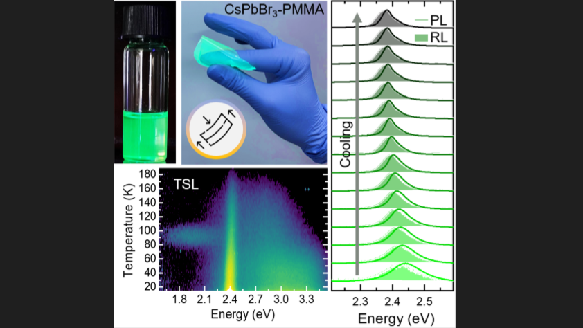 The modern research is considering scintillating nanocomposites based on lead halide perovskite (LHP) nanocrystals (NCs) for the next generation of scintillation detectors [3,4]; when embedded in polymeric matrices, LHP NCs favors the enhancement of the interaction cross-section with ionizing radiation, thanks to their high atomic number [5], and retain exceptional levels of radiation hardness [6]. The implementation of this novel class of scintillating composites is imperative and aims at the achievements of scintillators with improved performances. This goal is essentially linked to the fundamental understanding of the correlation between the physical-chemical properties and the luminescence features and to the comprehension of the scintillation mechanism in nanosystems, from the primary interaction with the ionizing radiation, through energy transfer and trapping processes, to the emission of light. A fundamental stage in the scintillation process is the transport of free carriers generated upon the interaction between ionizing radiation and the scintillating material: it is often largely affected by the presence of trapping sites, which can capture migrating charge carriers and either delay their radiative recombination or decrease the overall scintillation efficiency, according to the characteristics of the traps involved.