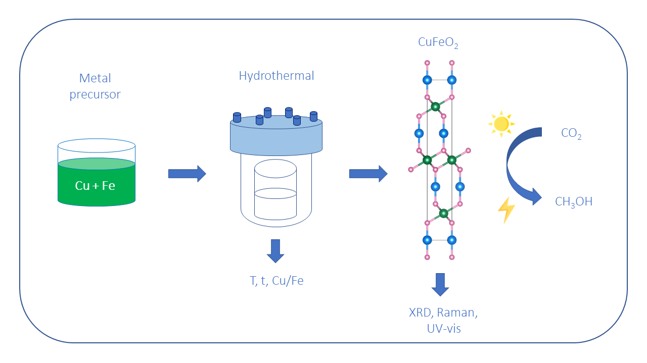 While continuously alarming reports regarding climate disasters appear in the media, the need for reduction of CO2 emissions becomes more urgent. An interesting solution is converting the harmful CO2 into a value-added chemical, such as methanol. The CO2 reduction can be realized in a photoelectrochemical cell, using a combination of solar energy and renewable electricity to provide the necessary energy. To design this system, efficient and selective semiconducting photoelectrodes which are also stable, low cost and non-toxic are needed.1,2 To achieve this, key characteristics of the photoelectrodes include for example their conduction band edge and bandgap. The aim in this project is to fabricate the CuFeO2 delafossite as a photocathode material. The delafossite is attractive as a natural p-type semiconductor that, compared to cuprous oxide, has shown a higher electrochemical stability, improved hole mobility and less susceptibility to photodegradation. However, it is challenging to synthesize this material, as it is a metastable, high temperature phase, existing only between 1015°C and 1090°C according to the thermodynamic copper-iron oxide phase diagram.3 Therefore, in the research at hand, a hydrothermal synthesis route for the delafossite CuFeO2 was studied. In general, hydrothermal methods are good candidates for the synthesis of metastable phases at low temperature. However, in literature, the hydrothermal synthesis for CuFeO2 is often reported without much attention to the detailed effects of the many different synthesis parameters nor to controlling reproducibility, which is known to require great care. Therefore, a systematic investigation of the synthesis process was conducted by a variation of important synthesis parameters such as the Cu/Fe ratio, reaction time and temperature. It was concluded that the formation of the delafossite CuFeO2 was obtained via a solution-based hydrothermal process after 12 hours at 120°C at various Fe/Cu ratios except for the Fe/Cu 1/1 ratio. The phase formation was verified by x-ray diffraction and Raman spectroscopy. Furthermore, the bandgap was studied with UV-vis spectroscopy and the sample surface and morphology were studied with TEM and Raman mapping. In conclusion, the CuFeO2 delafossite appears to have the potential to be a promising photocathode material for CO2 reduction.