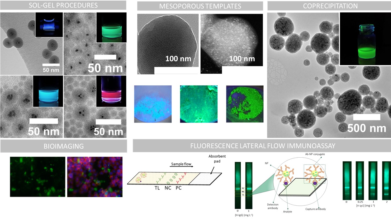 This work presents different strategies to prepare metal halide perovskite NCs stable in water and with suitable properties as luminescent tags. The approaches tackled include (A) an adaptation of the sol-gel process consisting of a post-synthetic chemical transformation of pre-synthesized NCs, either CsPbBr3 or Cs4PbX6, in the presence of silica precursors, [2-3] (B) in situ growth of perovskite NCs in silica mesoporous nanoparticles, (C) polymeric nanobeads produced by coprecipitation methods [4] and (D) adaptation of liquid atomization methods. The stabilized materials were successfully probed as fluorescent agents for staining mouse cell cultures and in immunosensing assays. Finally, we discuss open research challenges and future directions toward their final use as a luminescent tag.