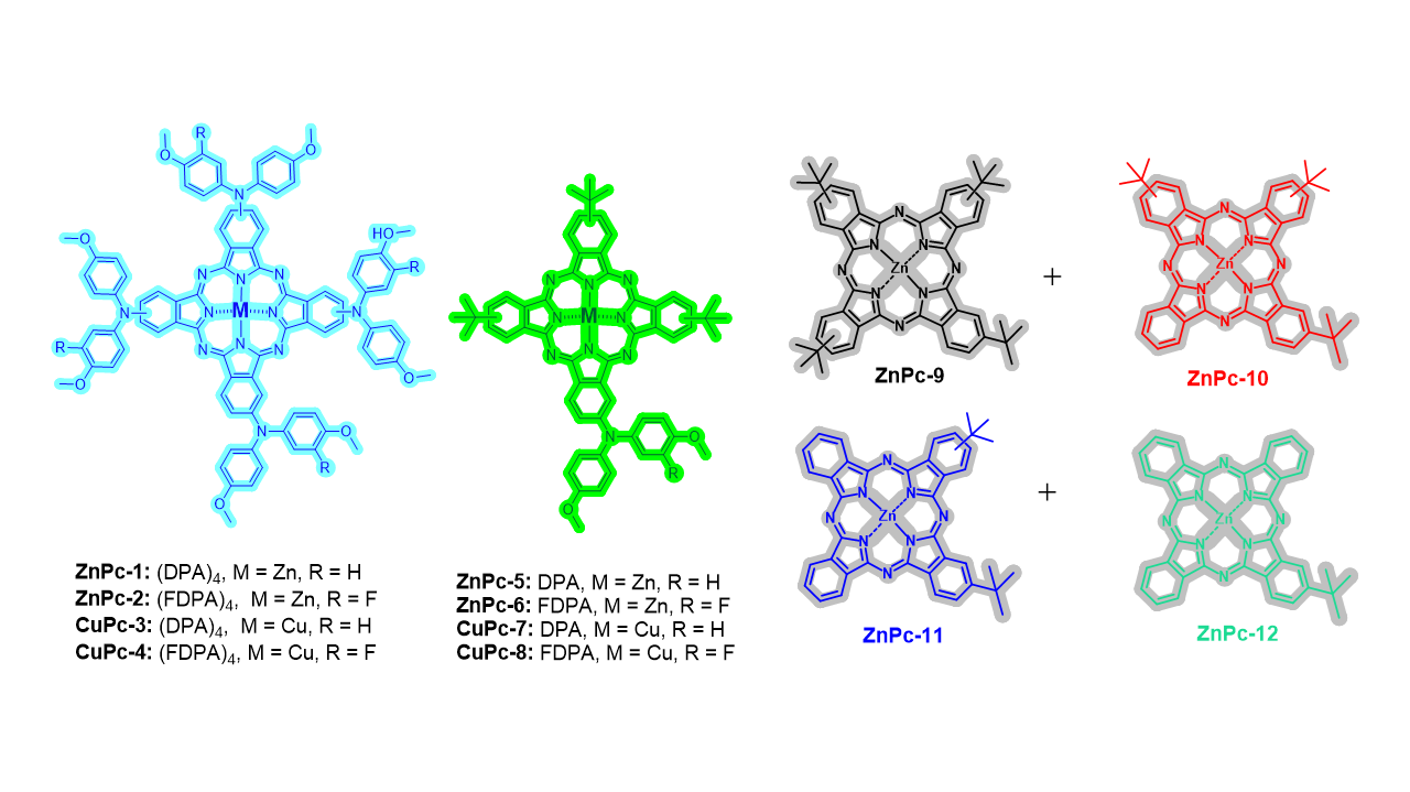 In this communication, we will present novel ZnPcs and CuPcs monomers [2] (see as examples Figure 1), among others, as efficient, stable, and low cost HTMs in PSCs. The MPcs are substituted with functional groups that possess a very good solubility in a wide range of organic solvents, adequate HOMO LUMO levels and their photovoltaics performance as high stable solution processing in a wide range of perovskite solar cell devices.
