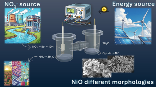 In this work, we investigate the influence of nickel oxide morphology on its electrocatalytic performance towards E-NO3-RR. For that purpose, three distinct preparation routes (precipitation, hydrothermal synthesis, and the reverse micelle method) were employed to generate NiO samples with varying morphologies. These materials were extensively characterized (e.g., via X-ray diffraction) and their electrochemical activity was tested employing an H-type cell with a three-electrode configuration.