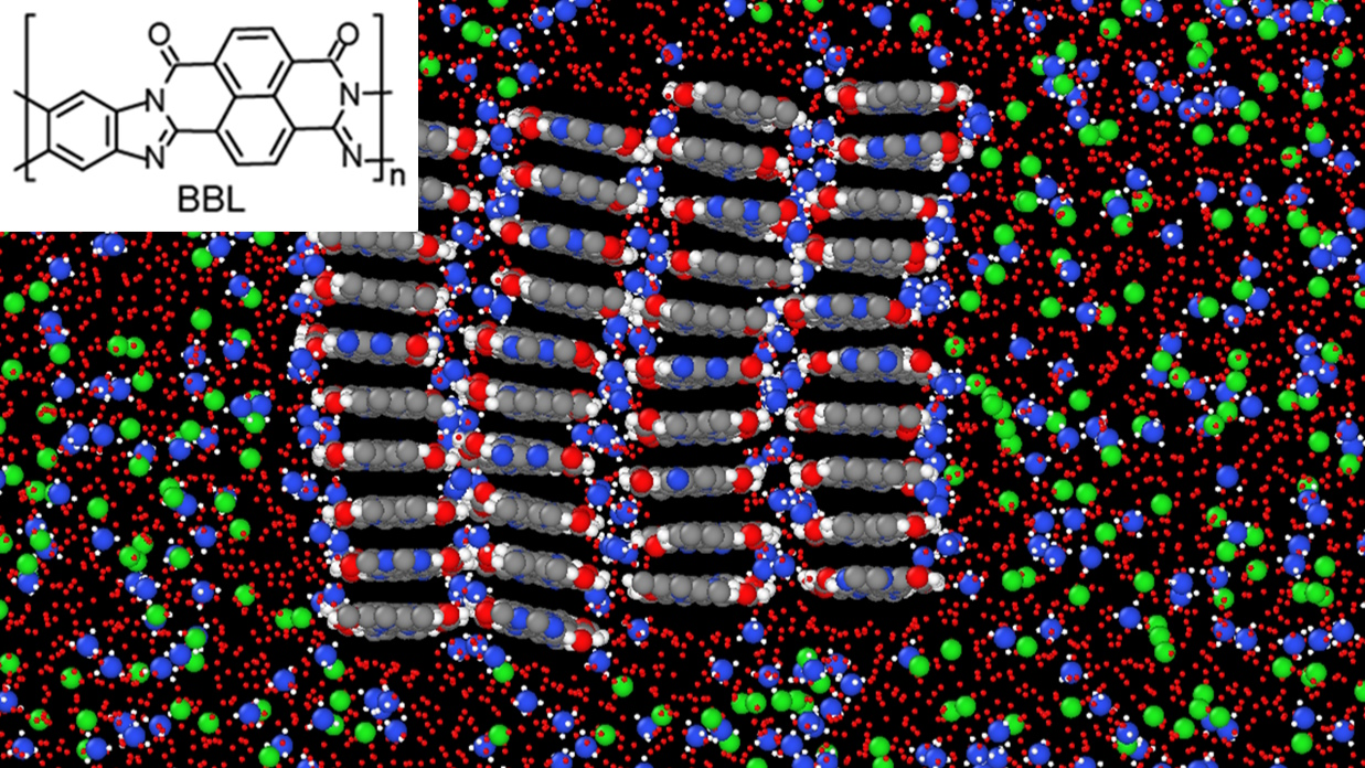 Organic electrochemical transistors (OECTs) rely on the use of organic mixed ionic-electronic conductors (OMIECs) as active channel materials [1]. These materials must simultaneously support electronic and ionic transport throughout the bulk of the film, enabling dynamic modulation of their redox states and conductivity via interactions with electrolyte ions and solvent molecules. Conjugated polymers have emerged as promising OMIEC platforms: their π-conjugated backbones facilitate electronic conduction, while their bulk structure allows for ion penetration and transport. In this context, poly(benzimidazobenzophenanthroline) (BBL), a ladder-type conjugated polymer with a rigid, planar backbone and high density of redox-active sites, provides a compelling model system [2]. Despite extensive experimental investigations, the atomistic-level understanding of ion and solvent interactions within BBL remains limited.