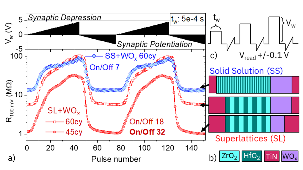 The relatively low crystallization temperature of polycrystalline hafnium oxide / zirconium oxide superlattices (HZO-SL) is compatible with the Back-End-Of-Line (BEOL) of CMOS transistors.[6], [7] These results not only demonstrate the functionalization of the BEOL with synaptic weights, but also pave the way for the integration of ferroelectric field-effect transistors with Beyond CMOS semiconductors.