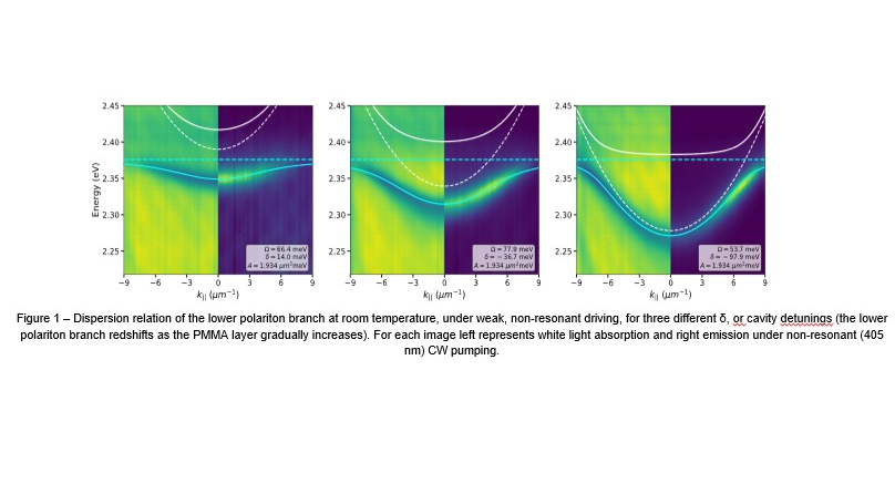 We implement a monolithic microcavity composed of two mirrors, a bottom distributed Bragg reflector made of 10 alternating SiO2 and TiO2 layer pairs, and a top silver mirror of ~20 nm thickness. Between them, we deposit 2D layered phenethylammonium (PEA2PbI4) perovskites of ~100 nm thickness. As a cavity spacer, we use PMMA polymer, whose thickness is controllably tuned to bring the photonic and excitonic modes in energy resonance. The vertical design of the planar microcavity system is guided by transfer matrix method simulations. We measure the dispersion relation of polaritons under white light (left-hand side of Fig. 1 panels) and weak, non-resonant driving for three exciton-photon energy detunings (right-hand side of Fig. 1 panels) resulting from the different PMMA thicknesses.
